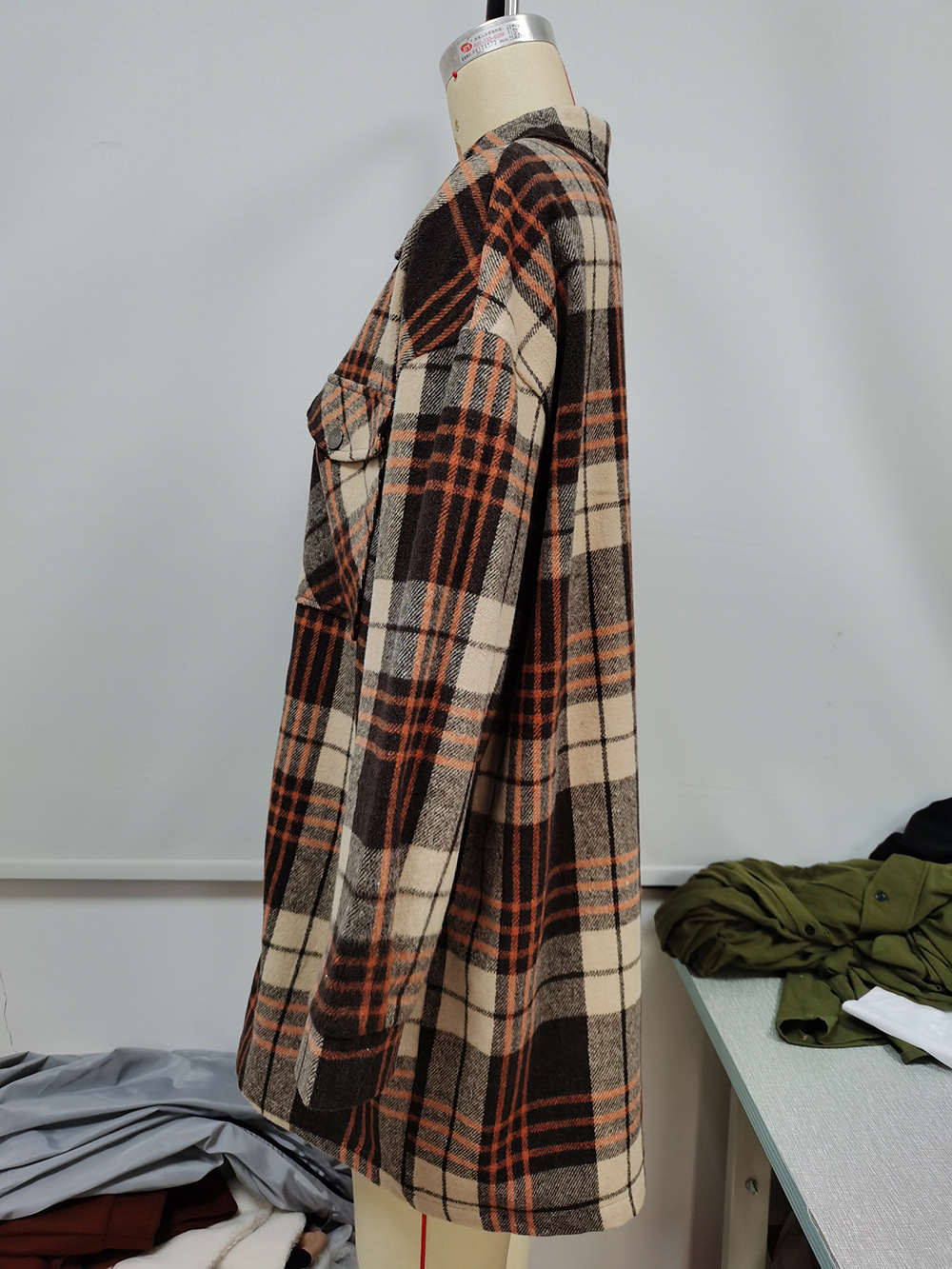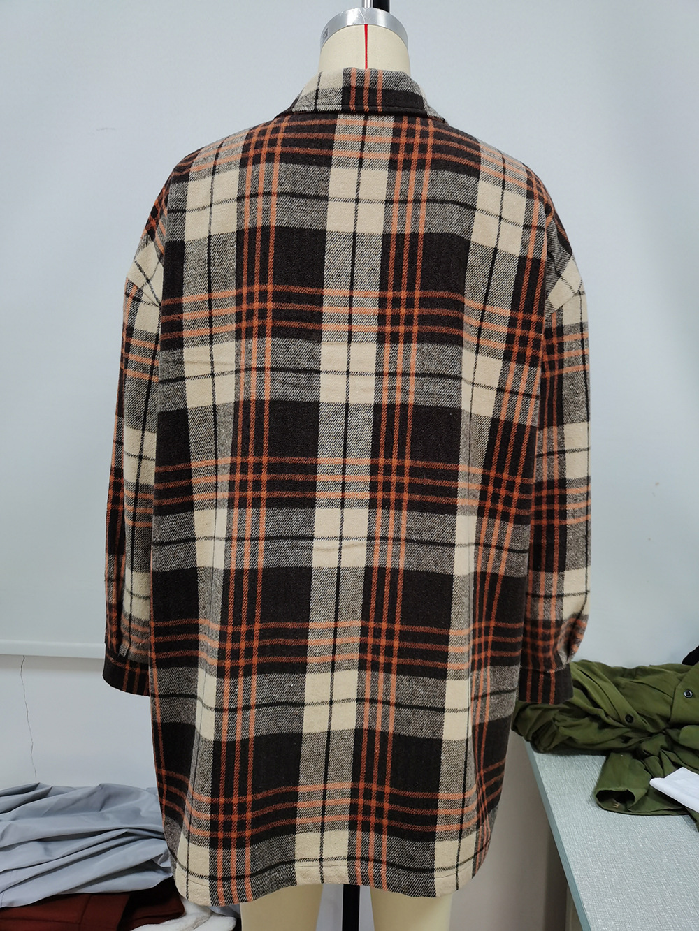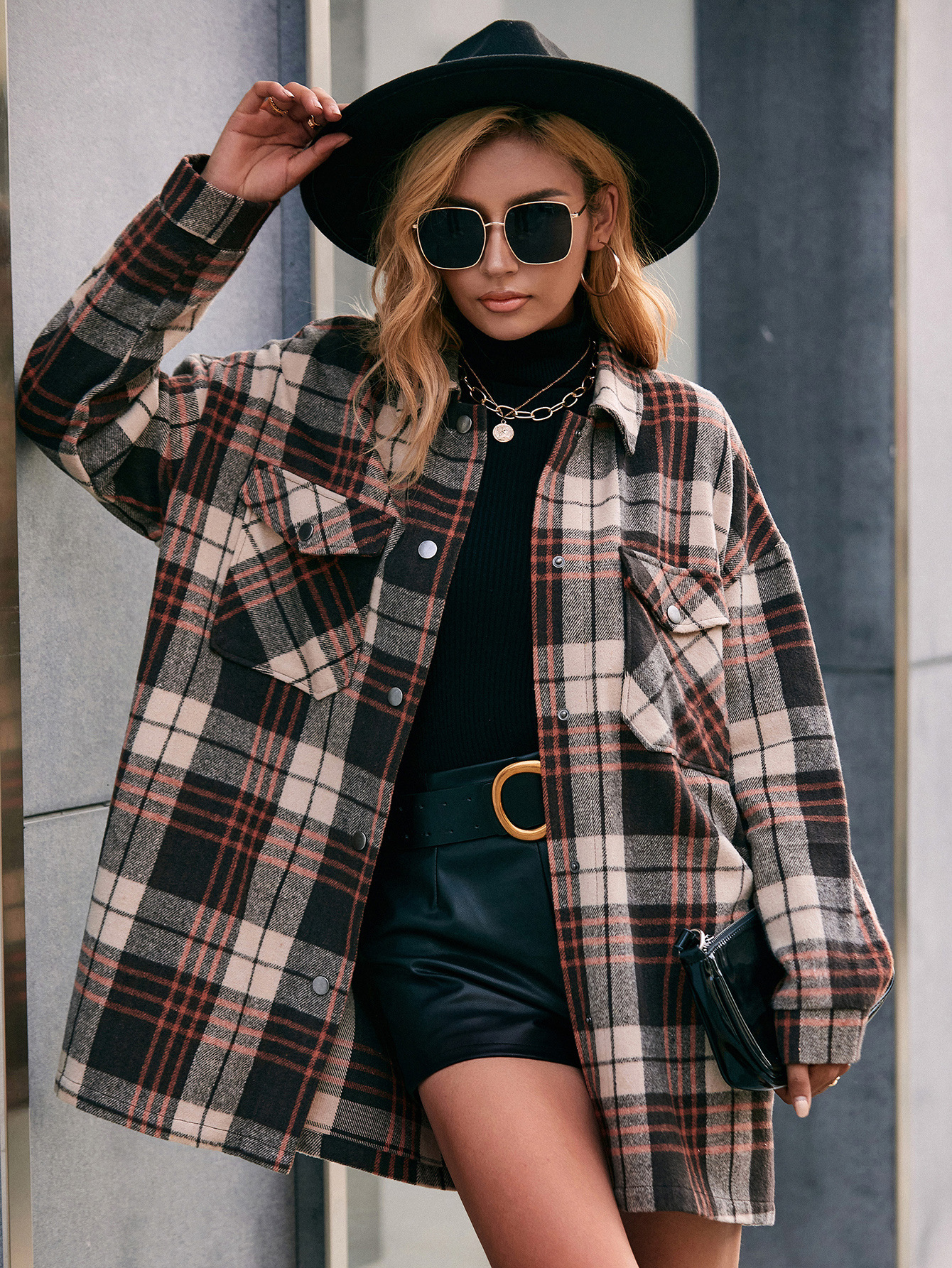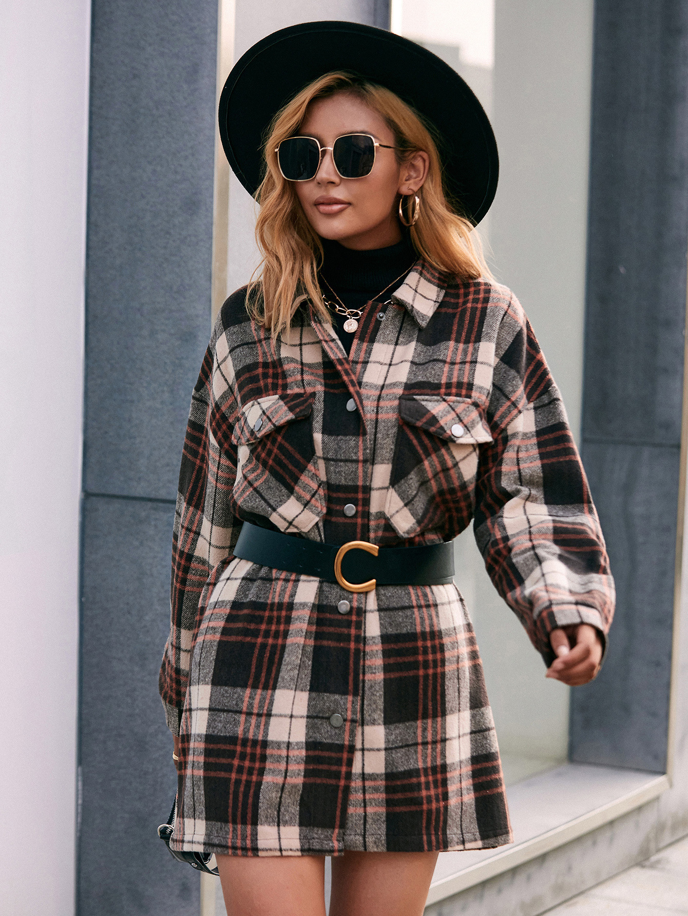 Casual Plaid Single Breasted Collared Mid Length Trench Coat Shacket Plaid Jacket Top