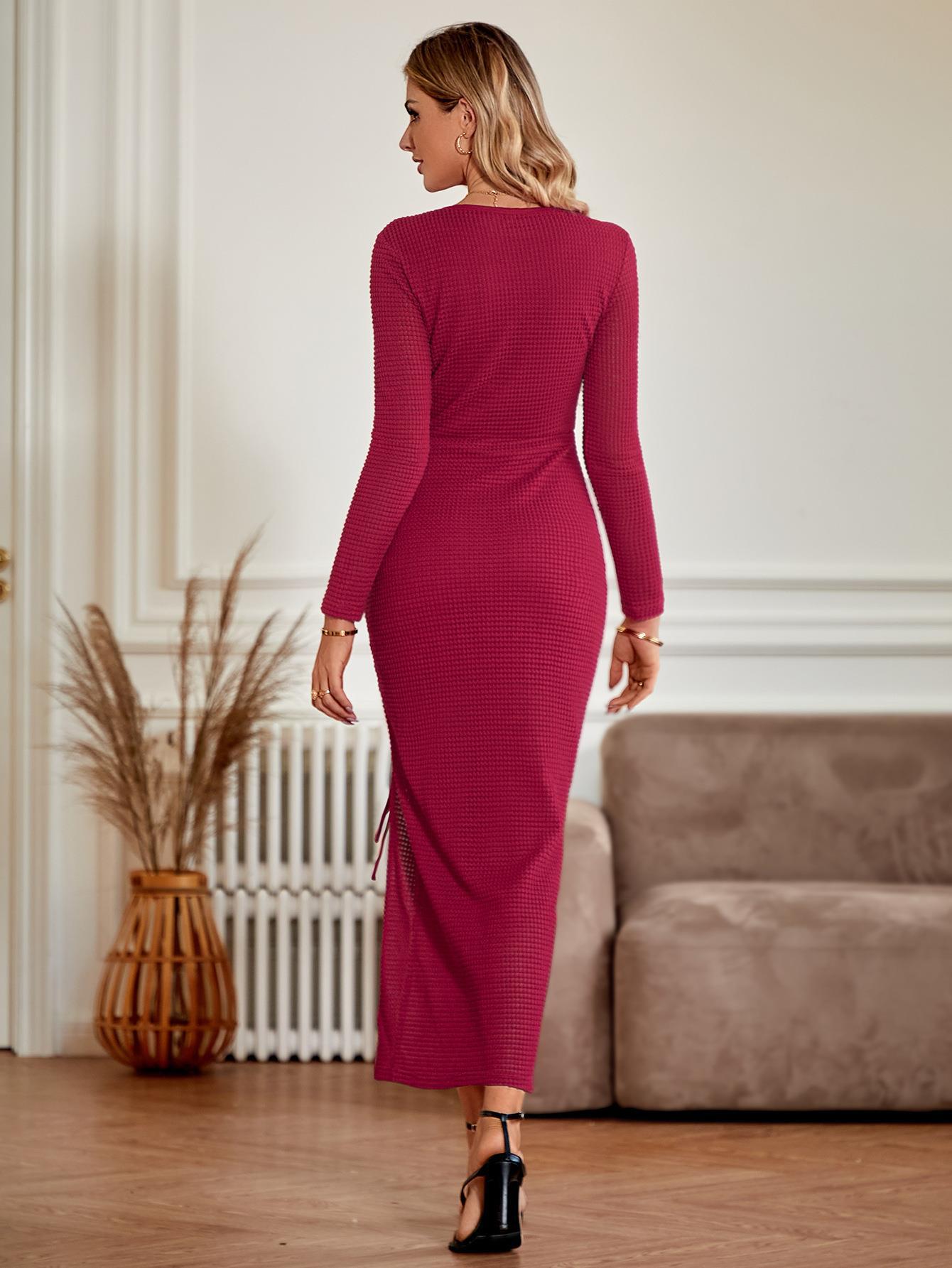 Casual U Neck Split Drawstring Long Sleeve Dress