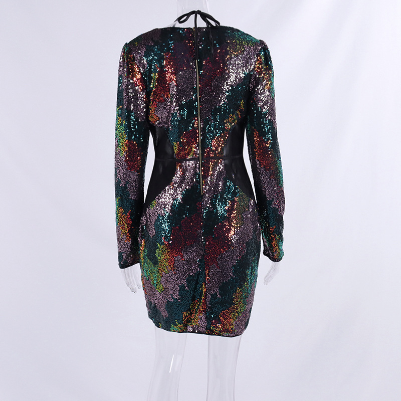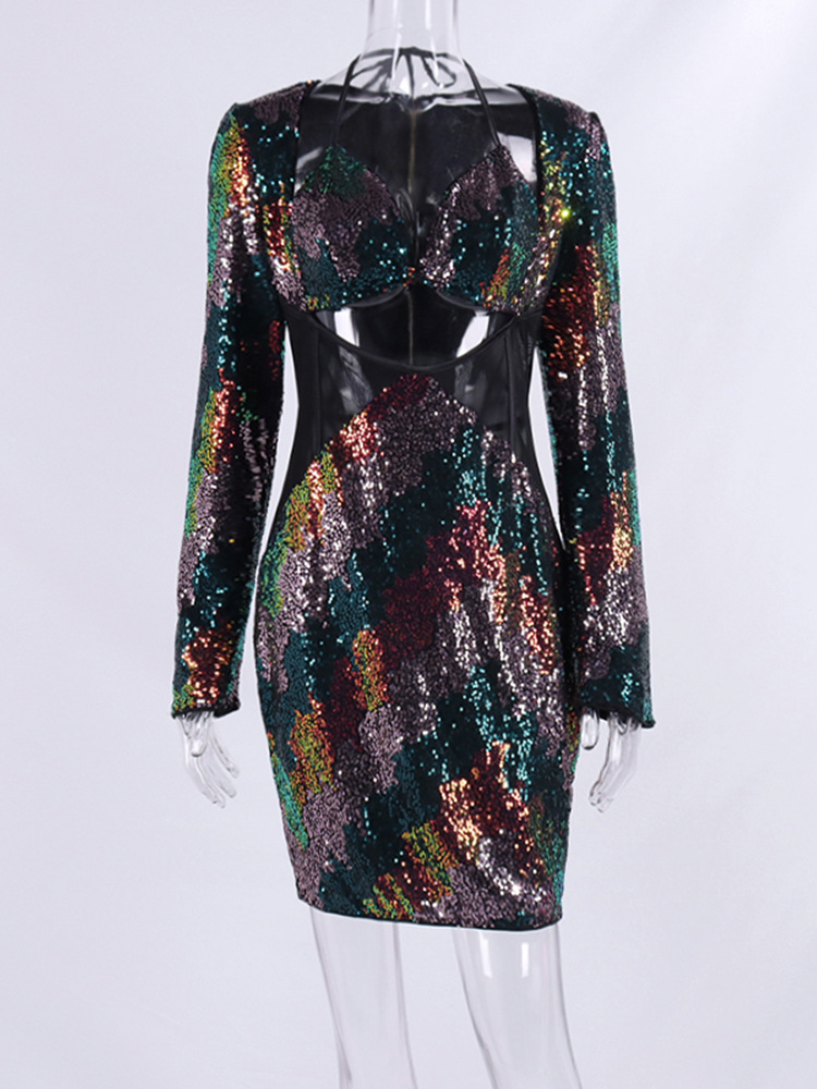 Christmas Dress Sequined Hollow Out Cutout out Spliced Long Sleeve Hip Dress