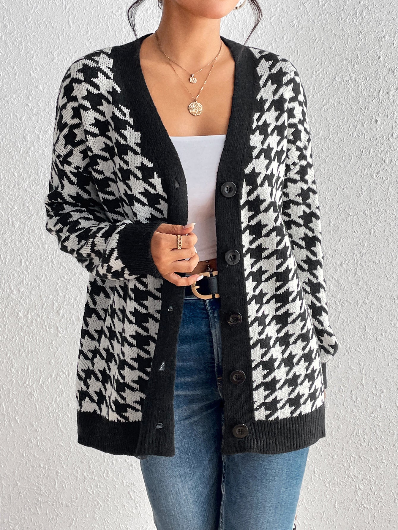 Contrast Color Houndstooth Cardigan Coat Knitted Sweater