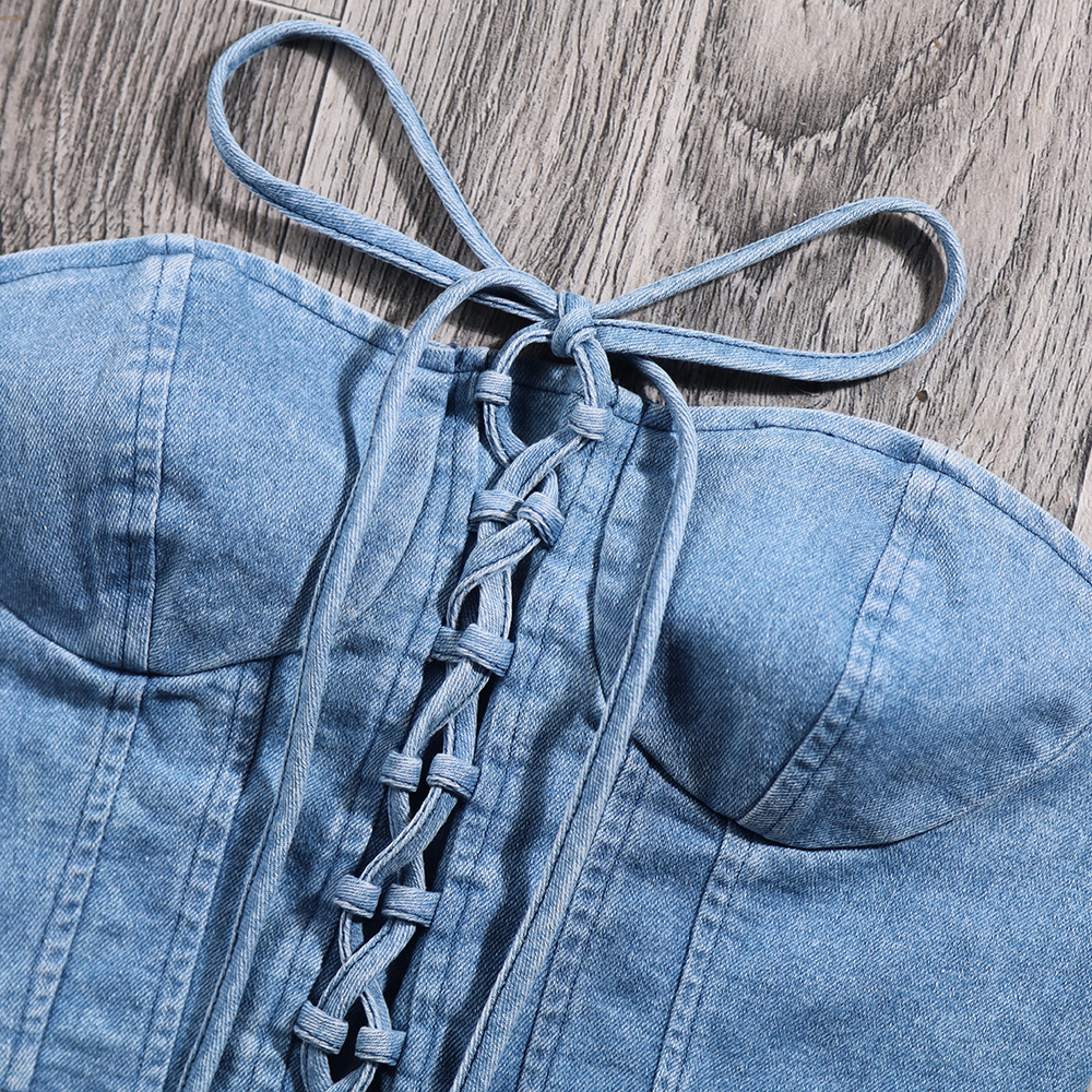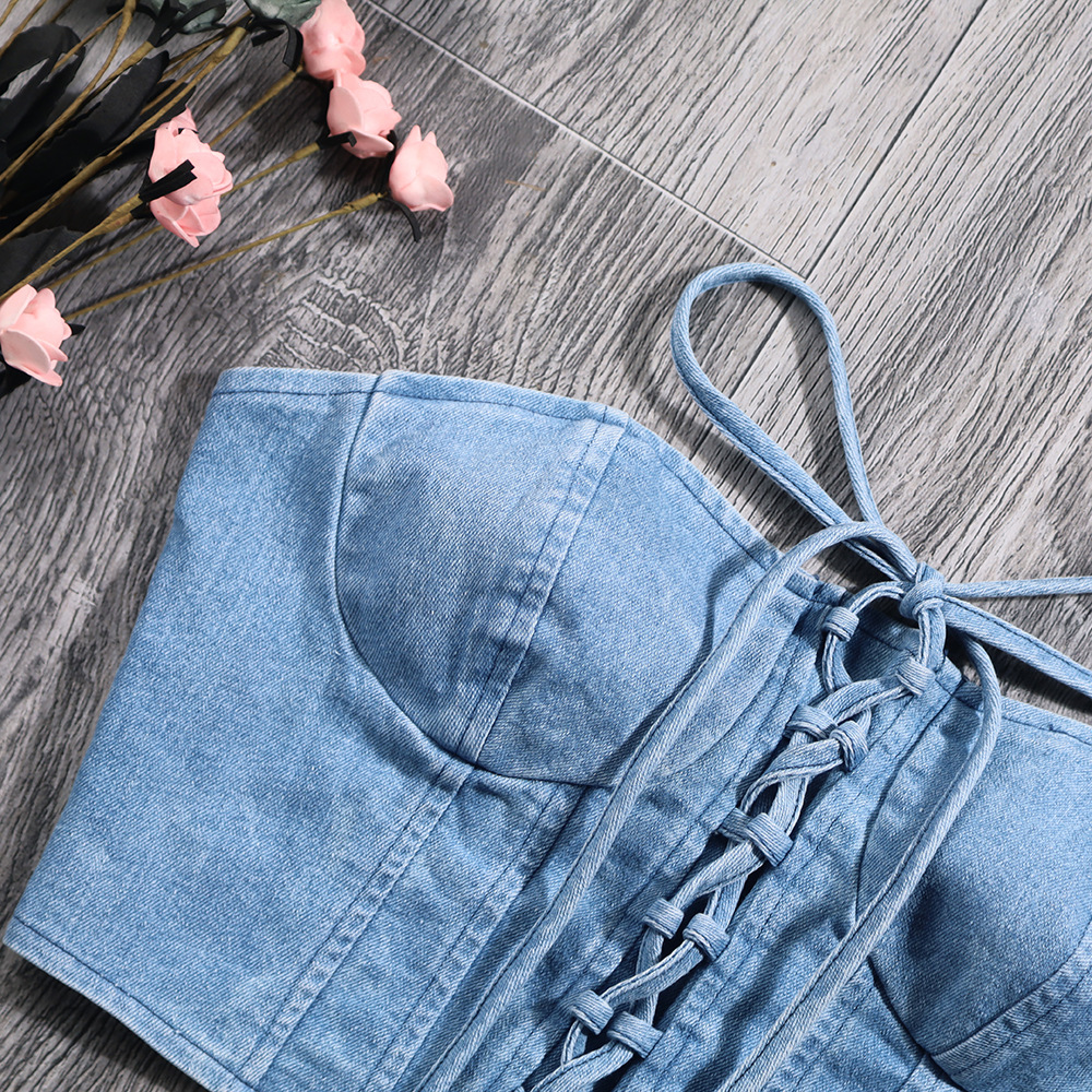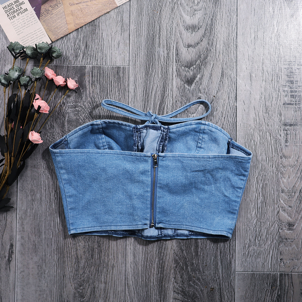 Crossover Lace up Denim Back Outer Wear Tube Top Casual Body Shaping Short Vest Zipper Wrapped Chest