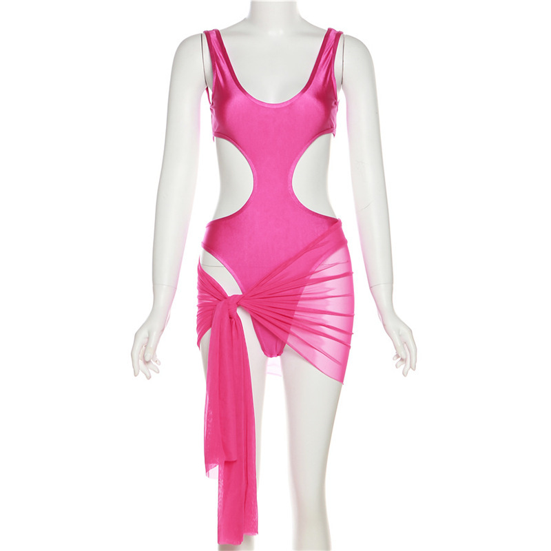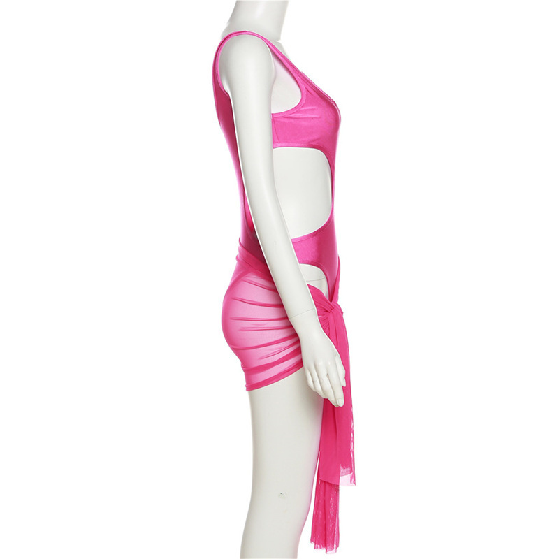 Cutout Tight Sleeveless Jumpsuit Mesh Lace up Skirt Set