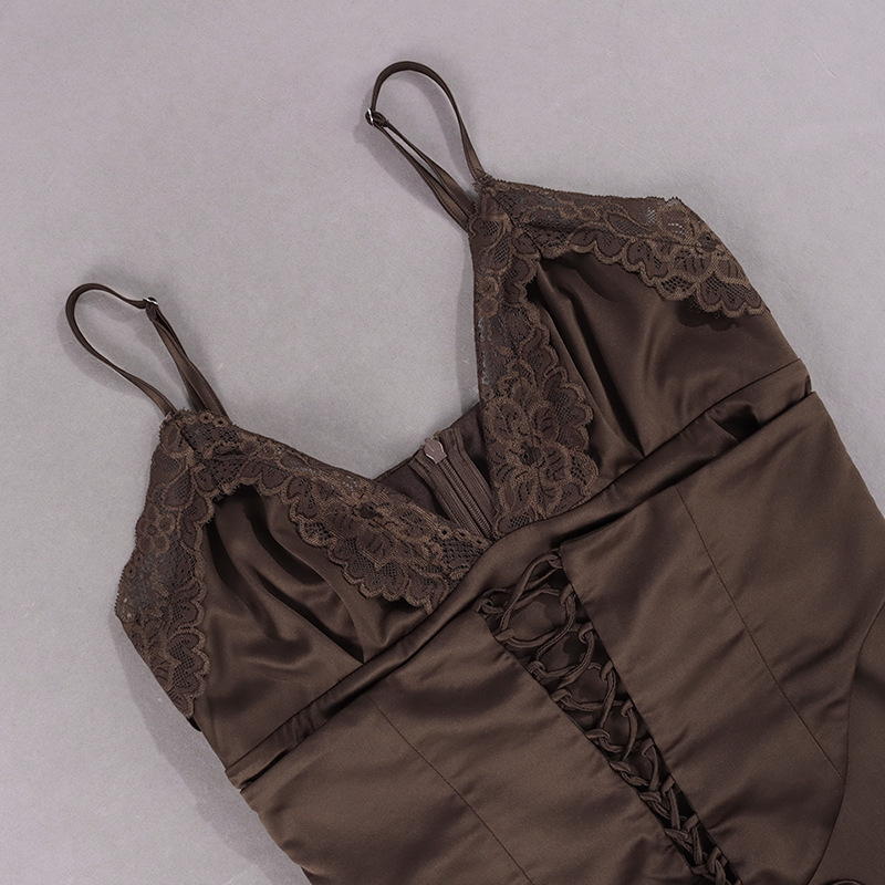 Dress Satin Lace V neck Patchwork Lace up Backless Dress