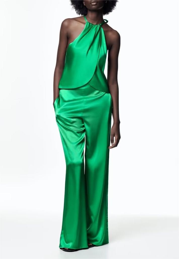 Early Silk Satin Texture Hanging Collar Short Top Straight Leg Trousers Suit