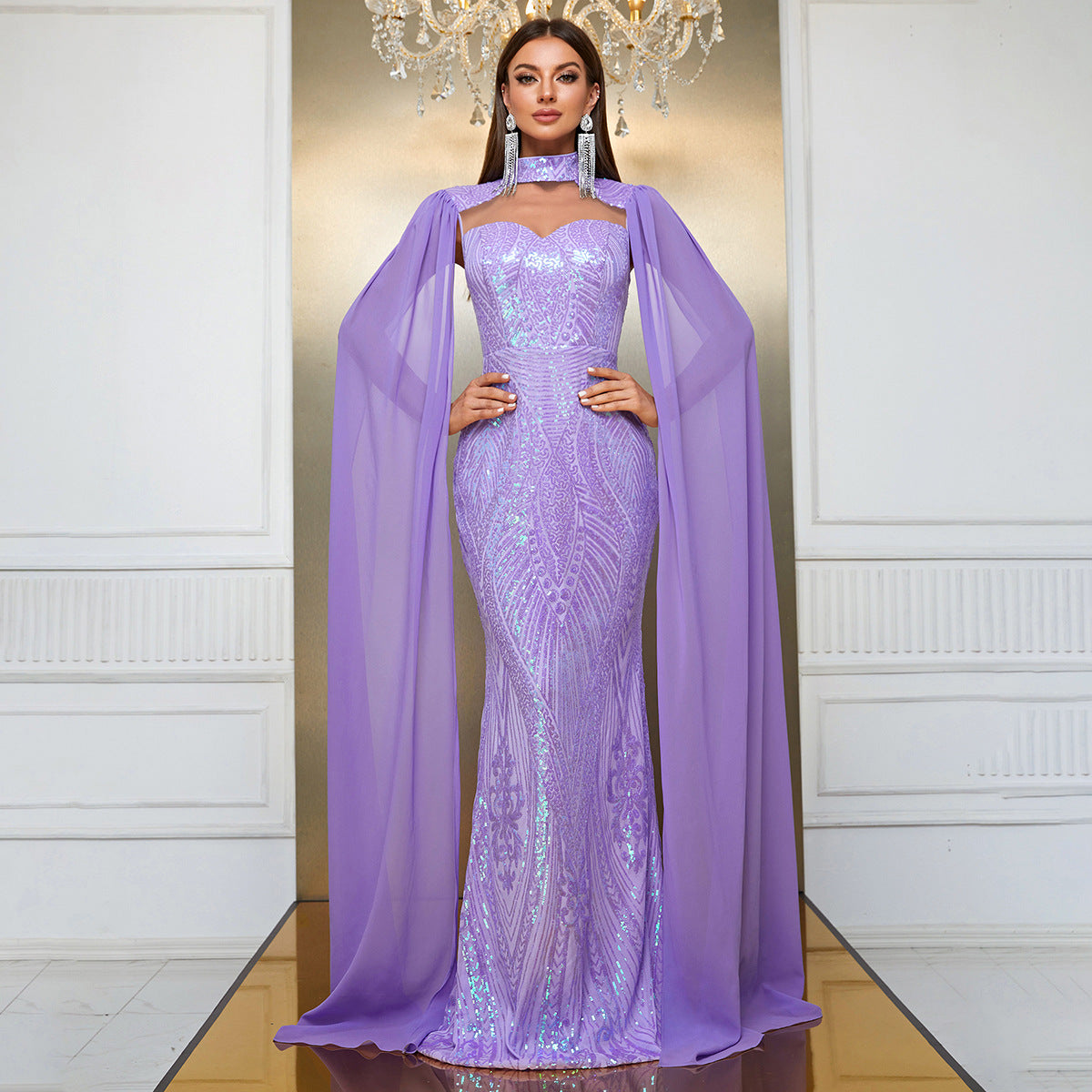 Evening Dress Sequined Halter With Shoulder Sleeves Party Dress Fishtail Dress Elegant Dress Dress