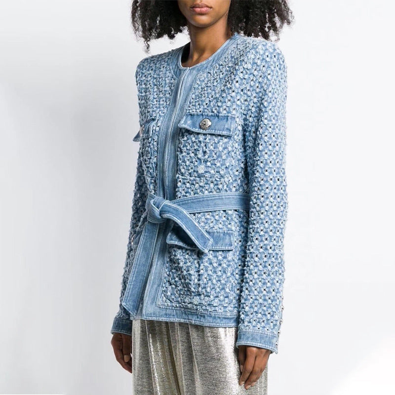 Fall Denim Jacket Casual round Neck High Waist Lace up Cutout Long Sleeve Slim Jacket Tops