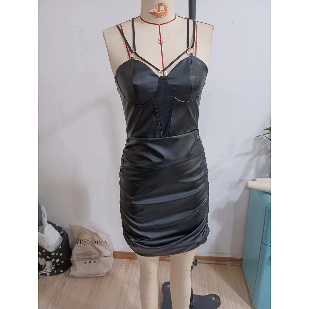 Faux Leather Pleated Nightclub Hip Spaghetti Straps Short Dress