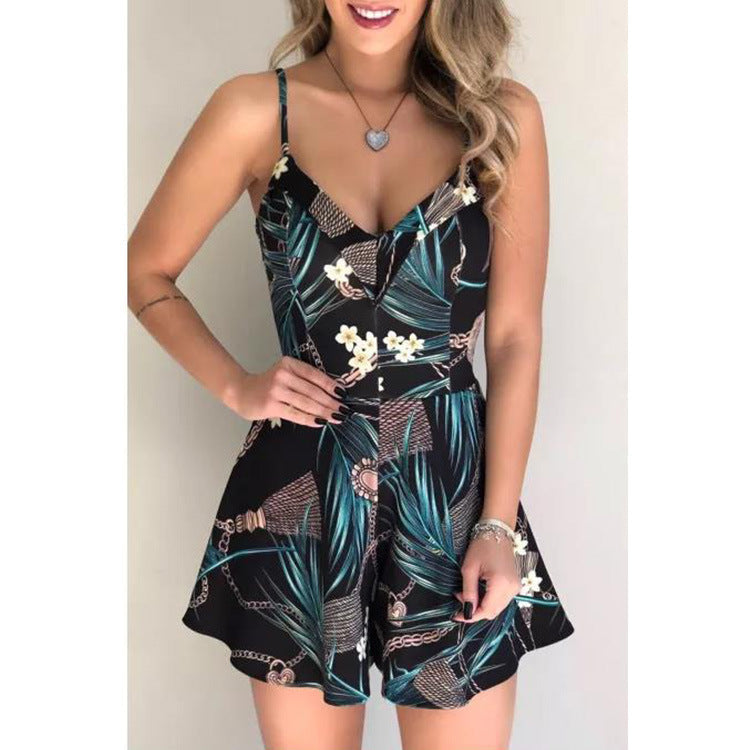 Floral Spaghetti Strap High Waist Short Flared Jumpsuit