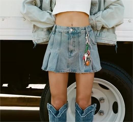 French All Matching Mid Waist Slim Fit Wide Pleated Denim Skirt