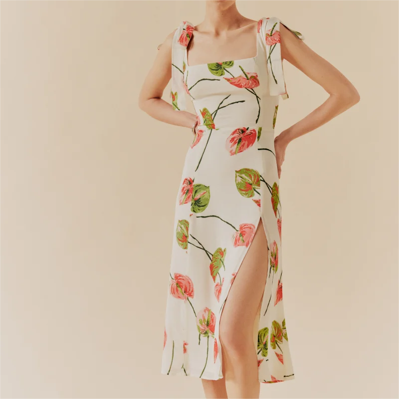 French Elegant Pastoral Printed High Slit Strap Dress Tube Top Mid Length Dress