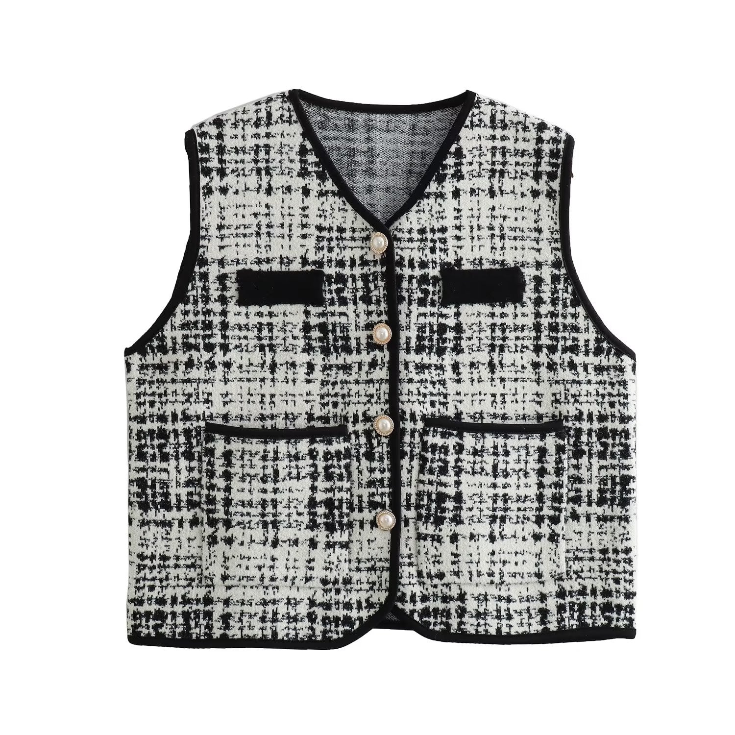 French Plaid Edging V neck Buttons Decoration Sleeveless Knit Vest Vest