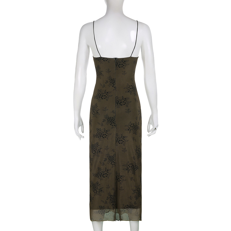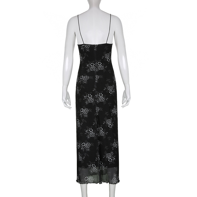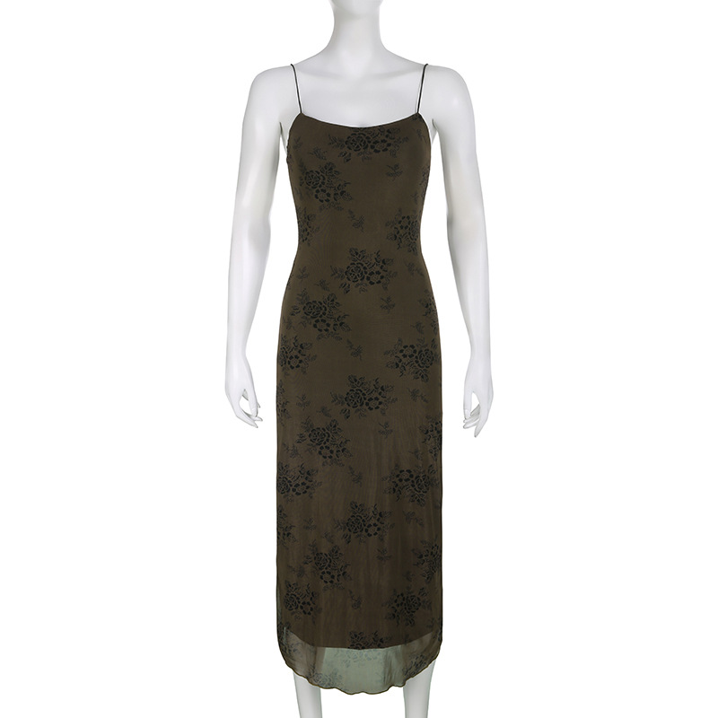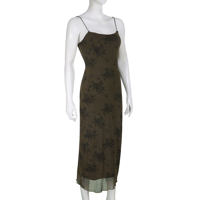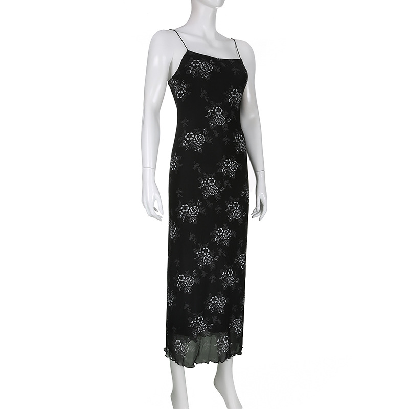 French Retro Elegant Adult Lady Woman Floral Print Maxi Dress Mesh Wooden Ear Off Neck Slim Strap Long One Step Dress