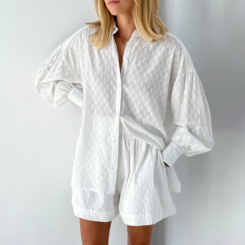 French White Jacquard Cotton Puff Sleeve Casual Shorts Suit Homewear Cool Pajamas
