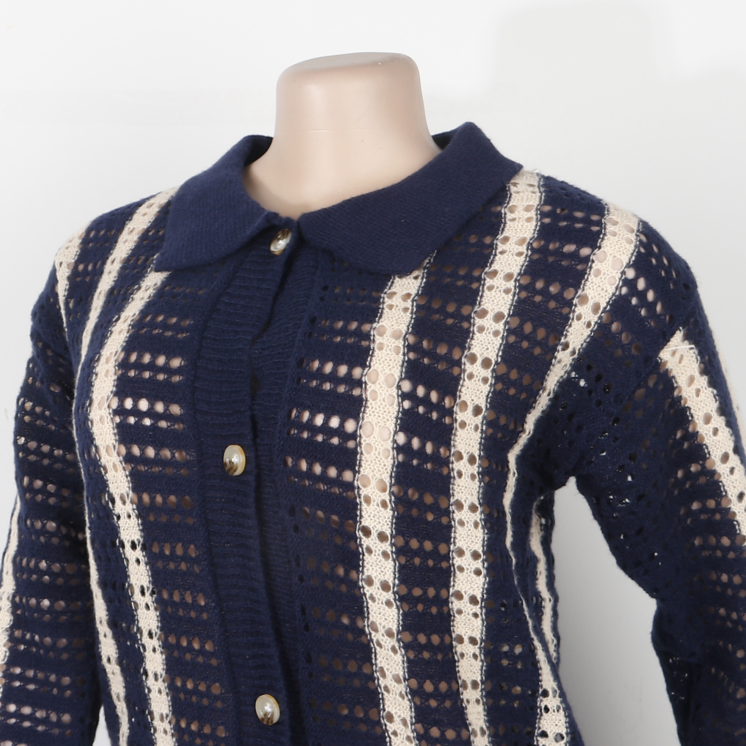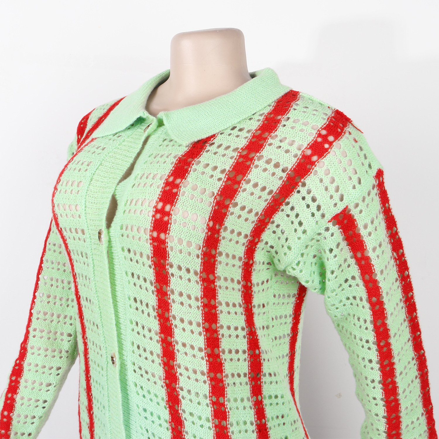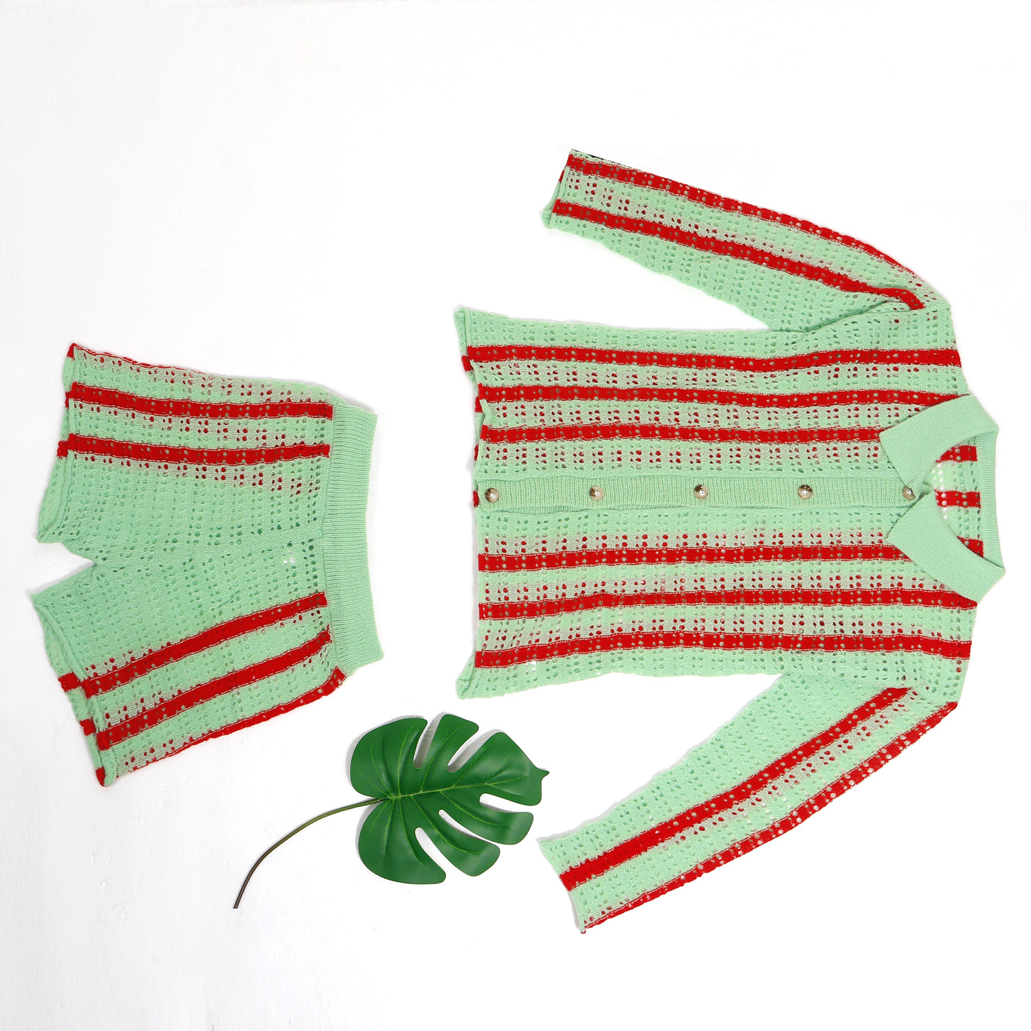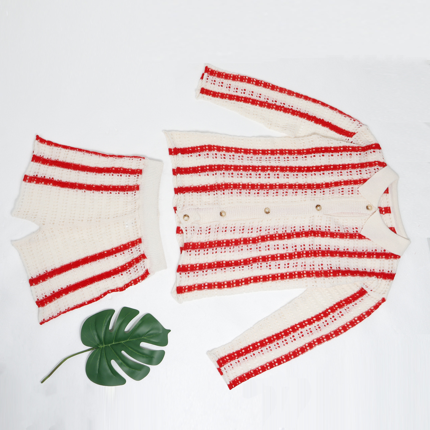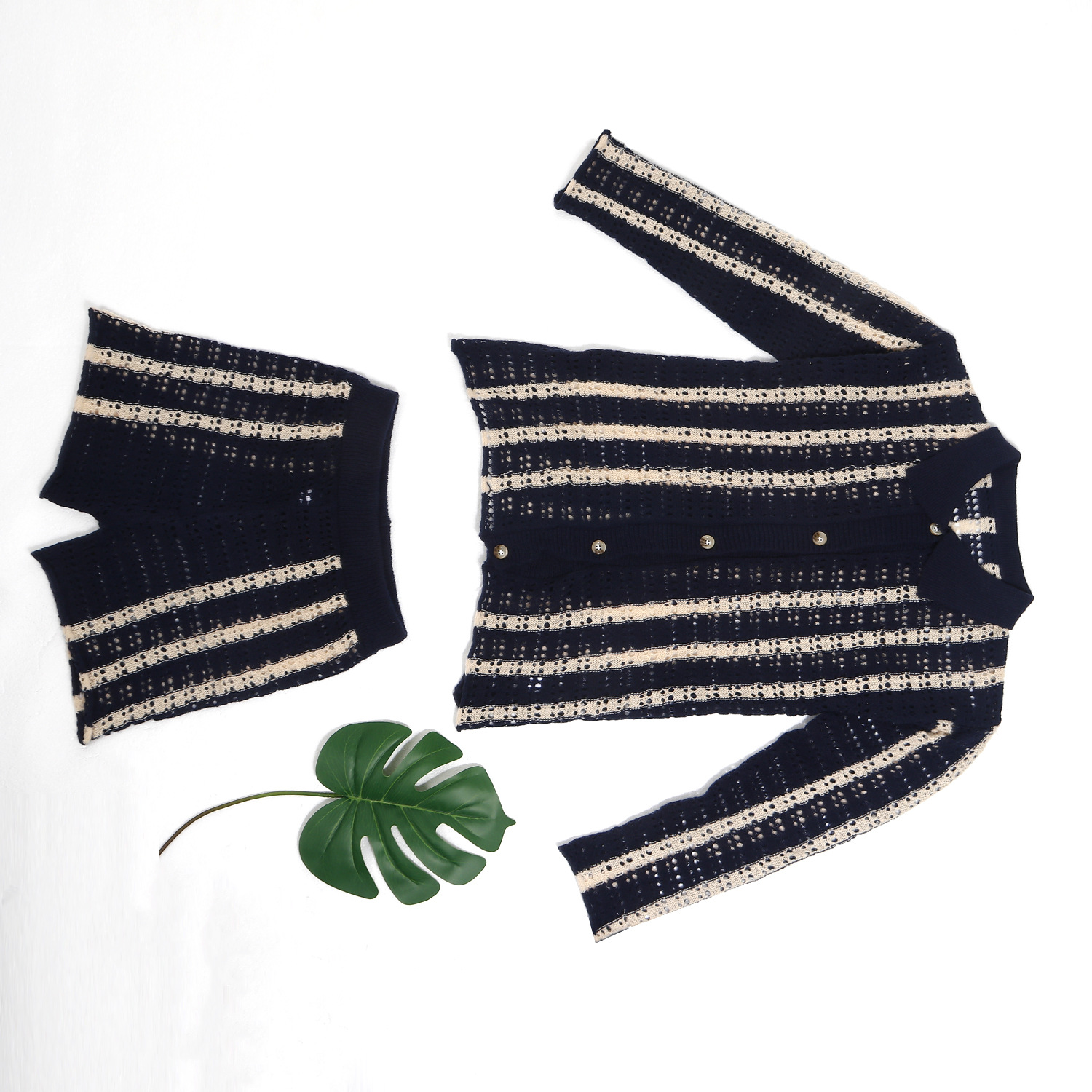 High Collared Slim Cardigan Button Stripe Two Piece Sweater