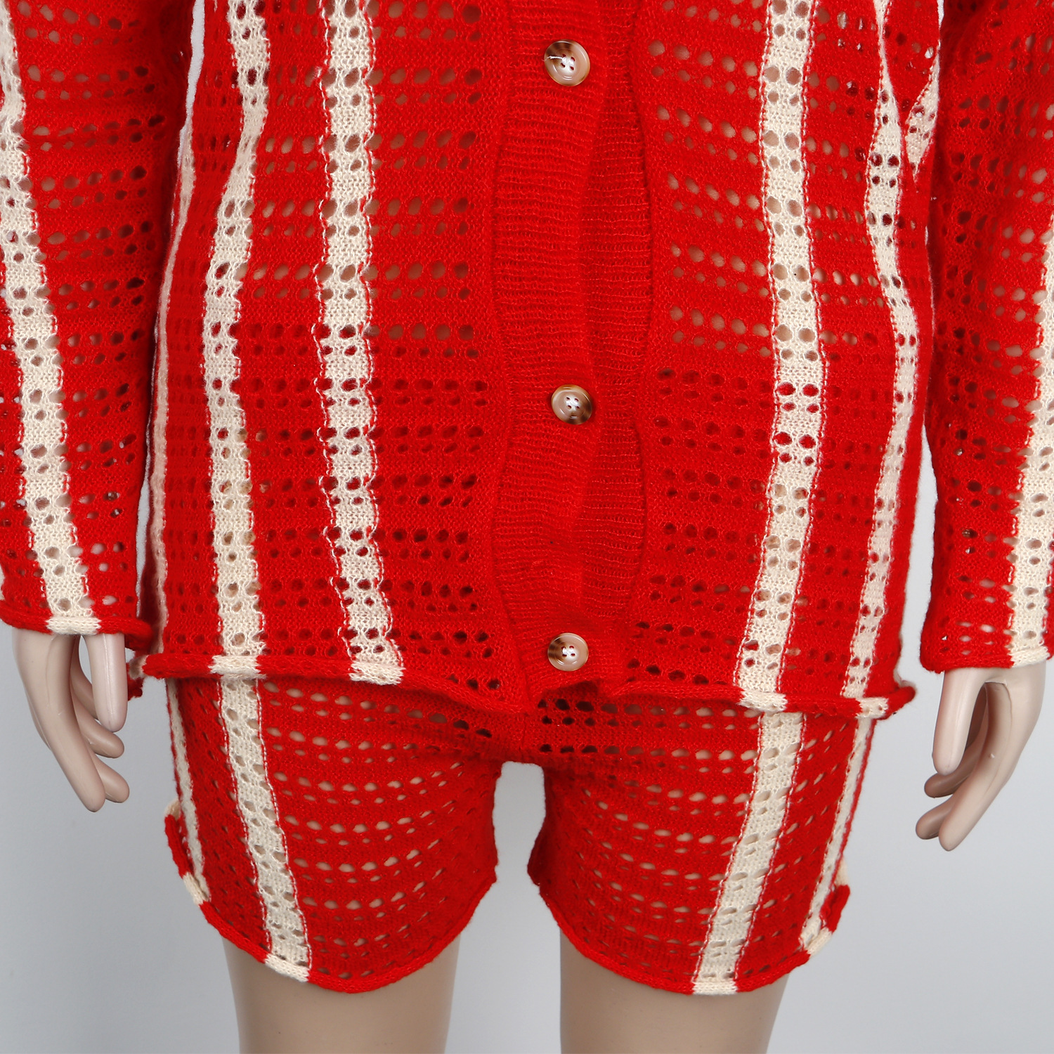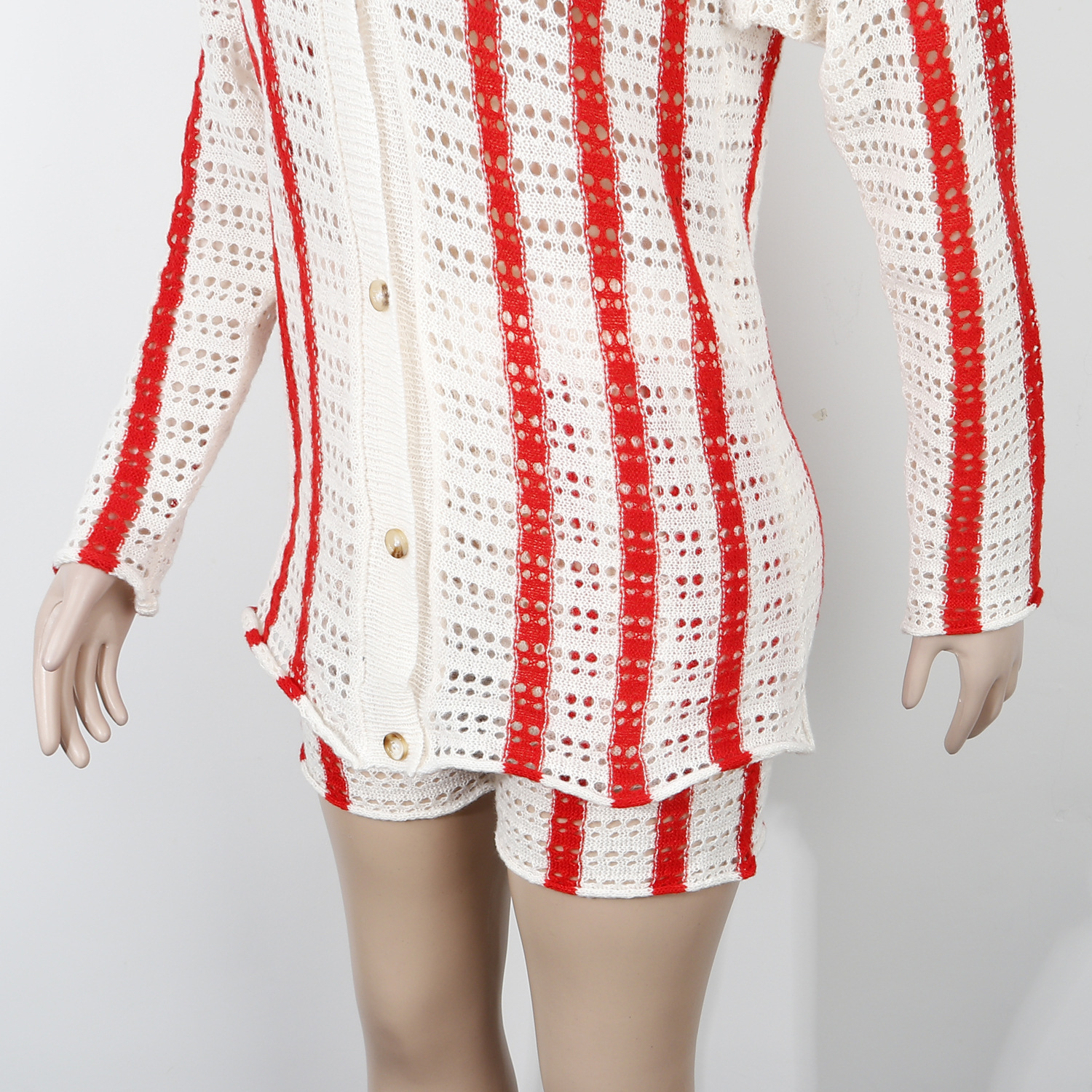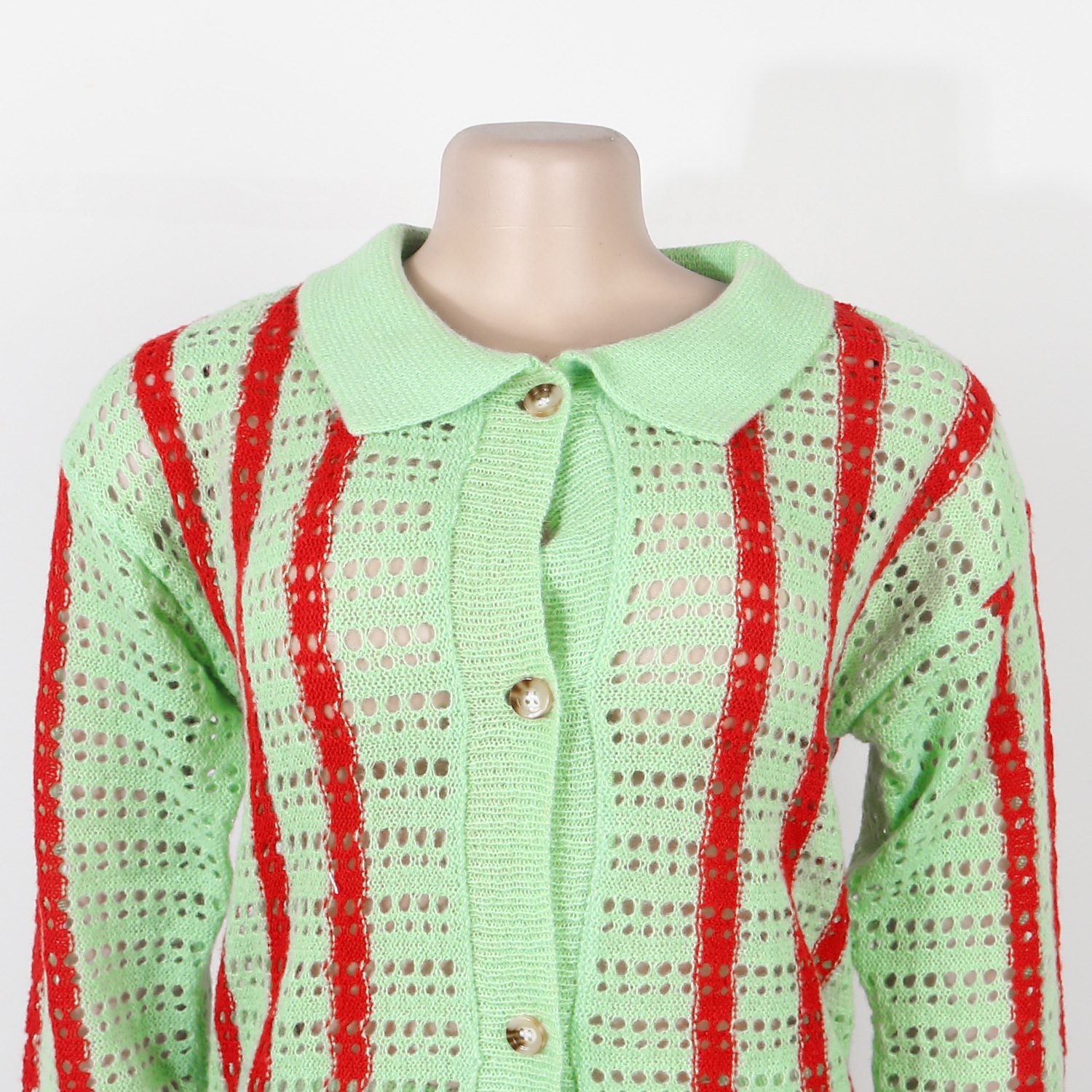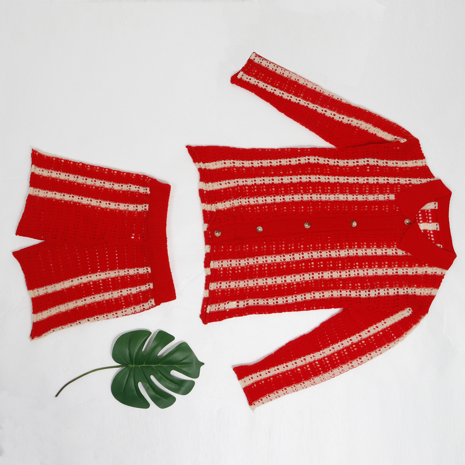 High Collared Slim Cardigan Button Stripe Two Piece Sweater