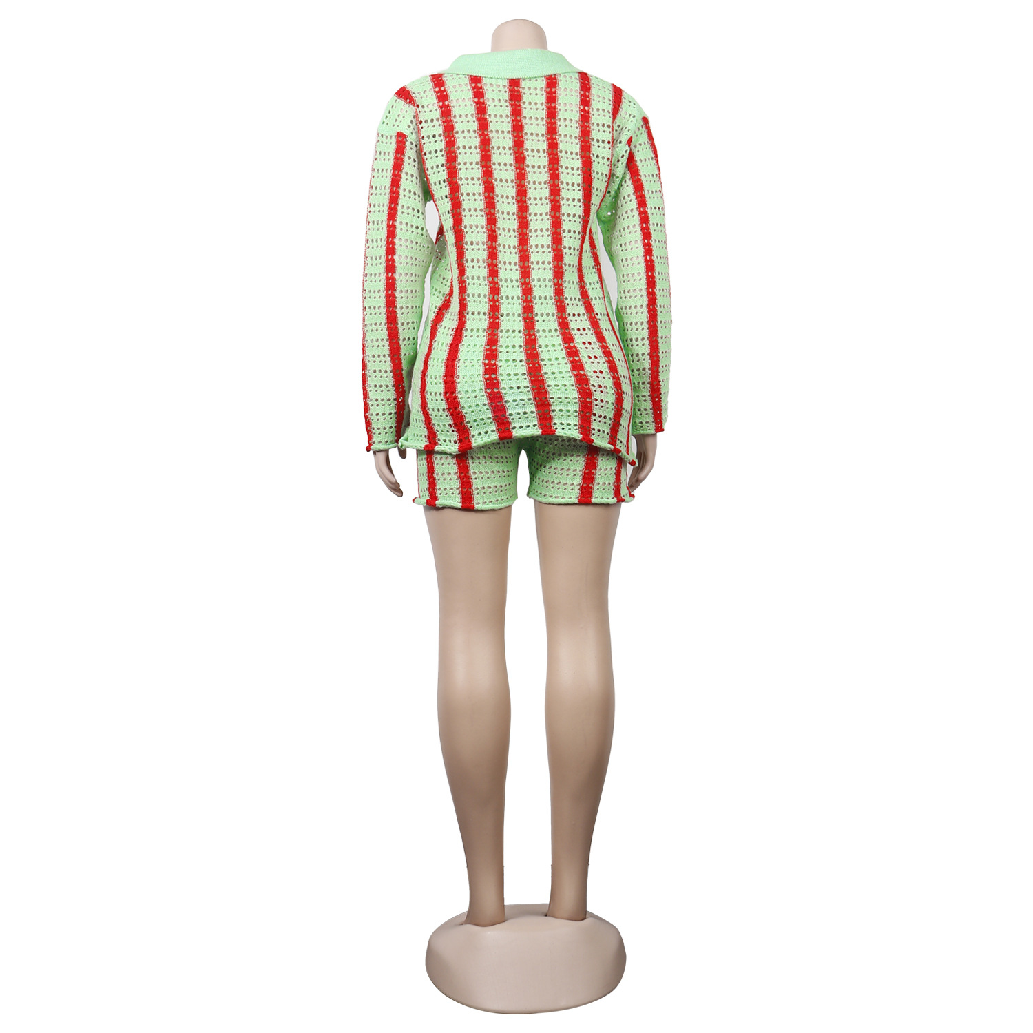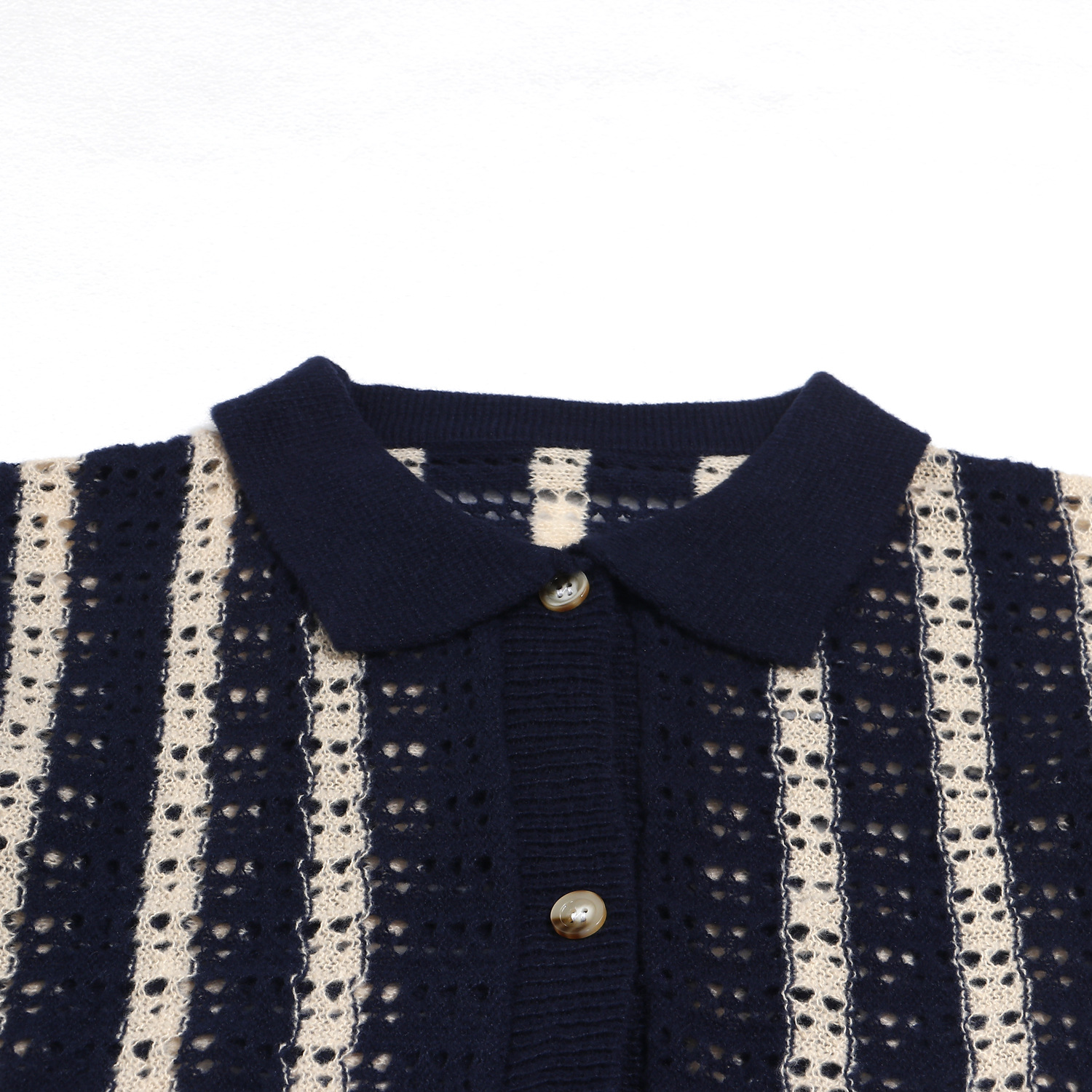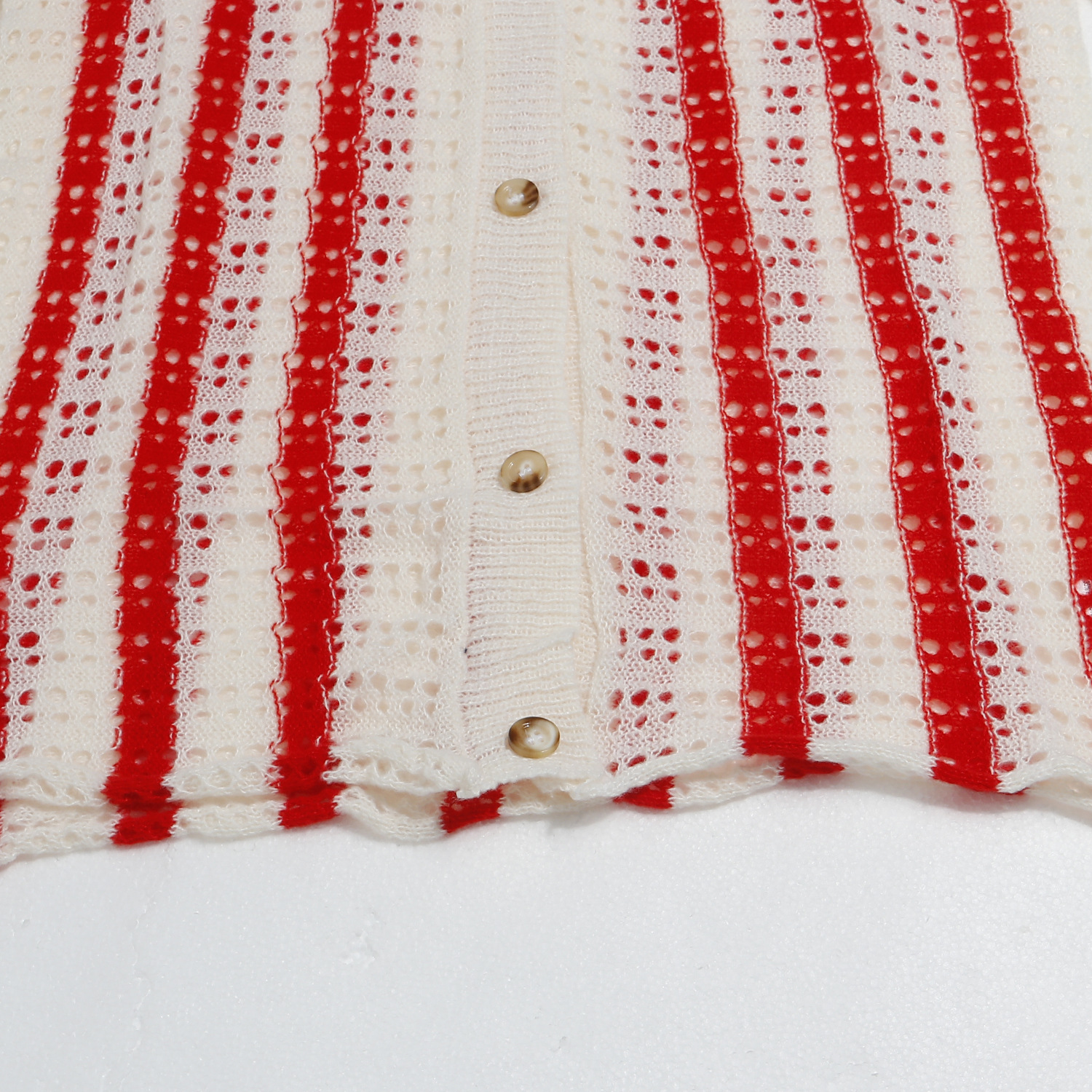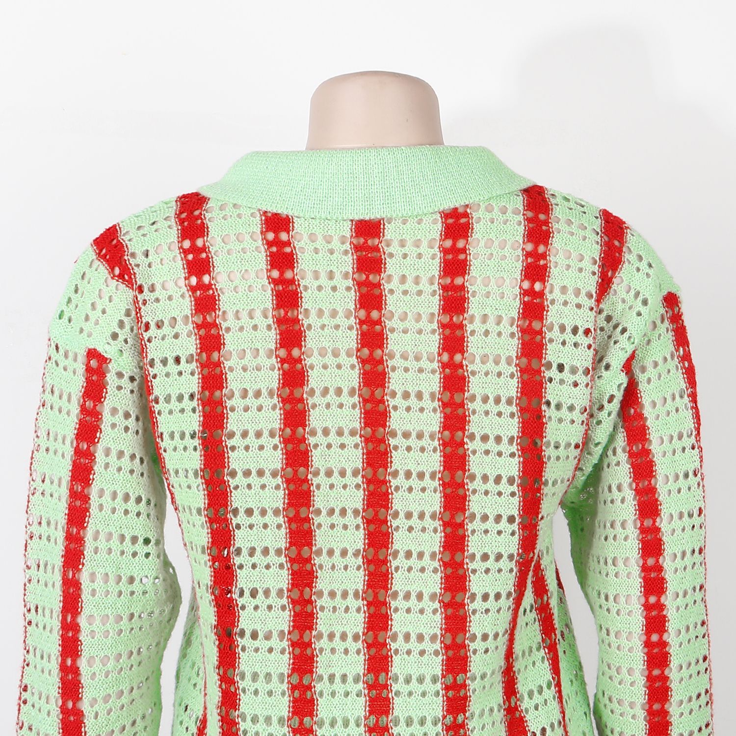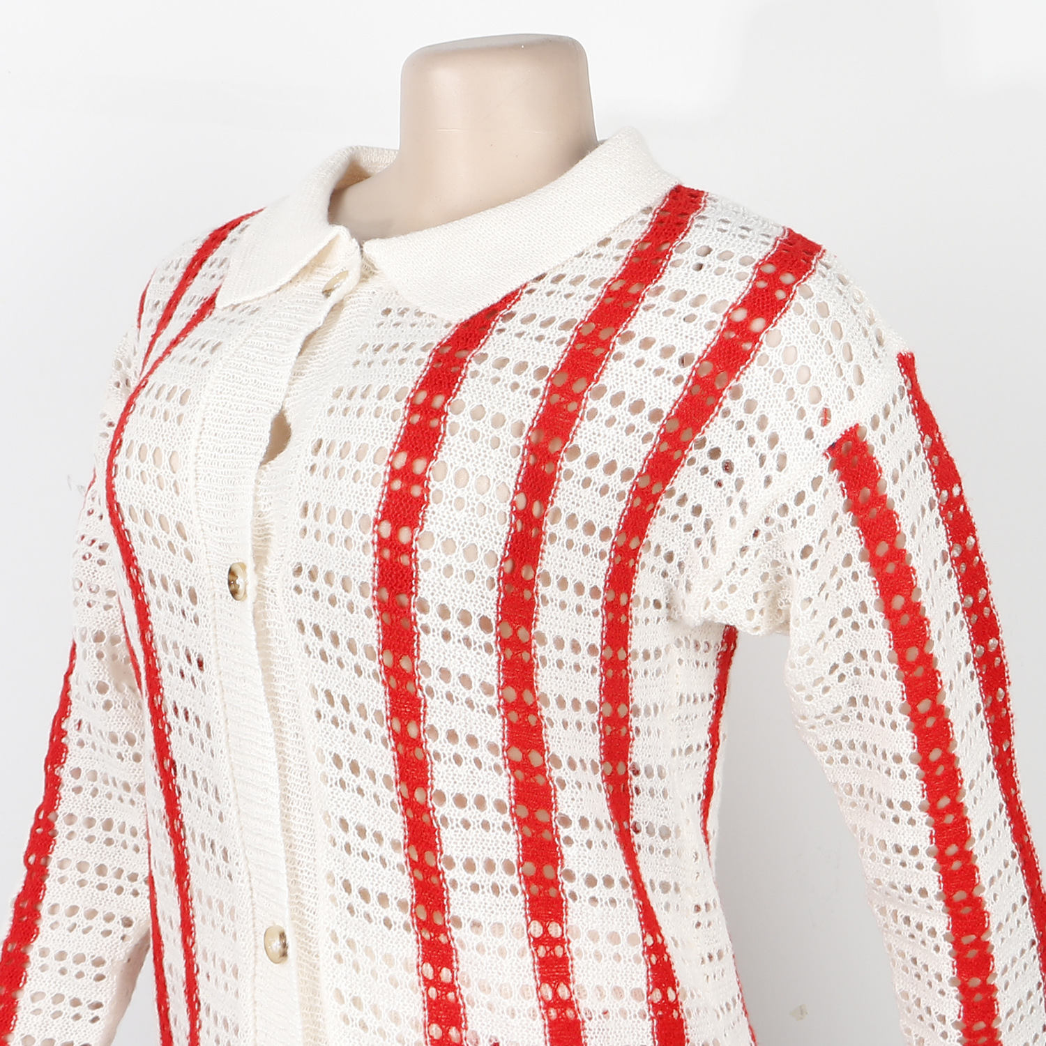 High Collared Slim Cardigan Button Stripe Two Piece Sweater