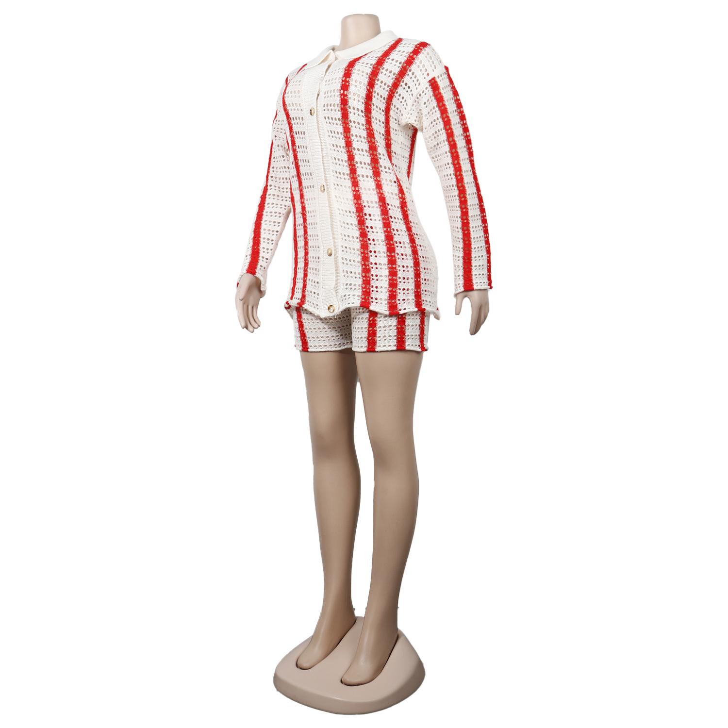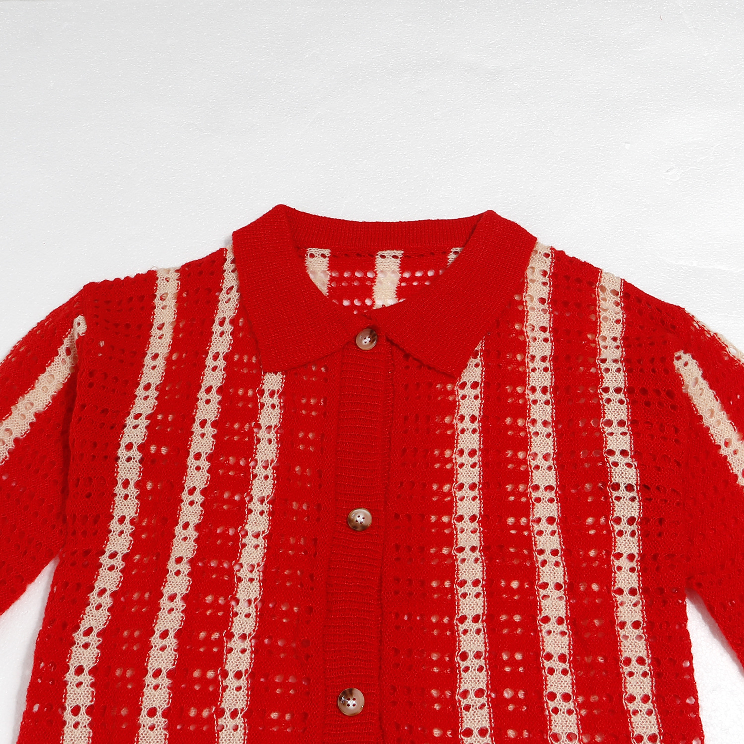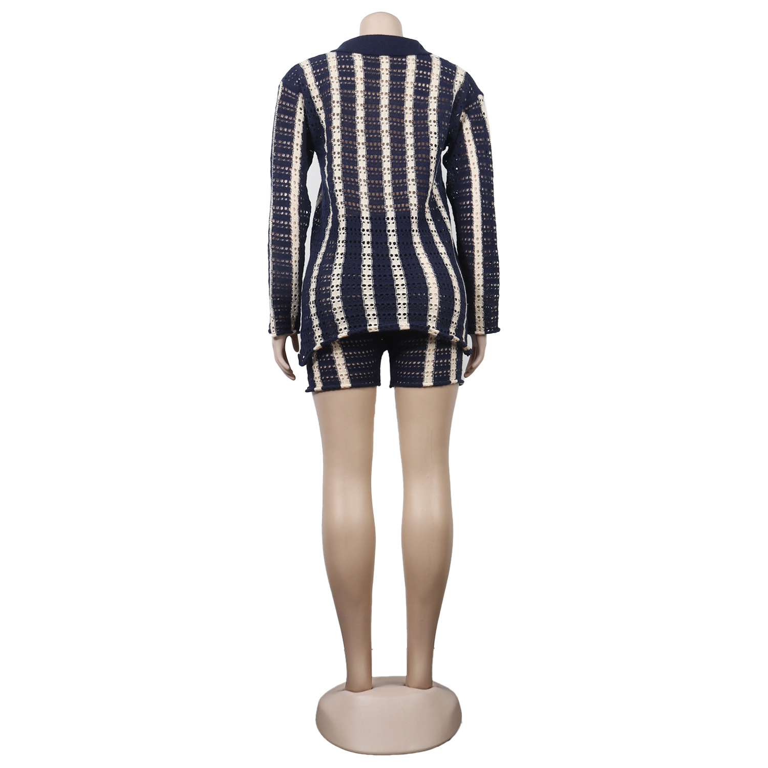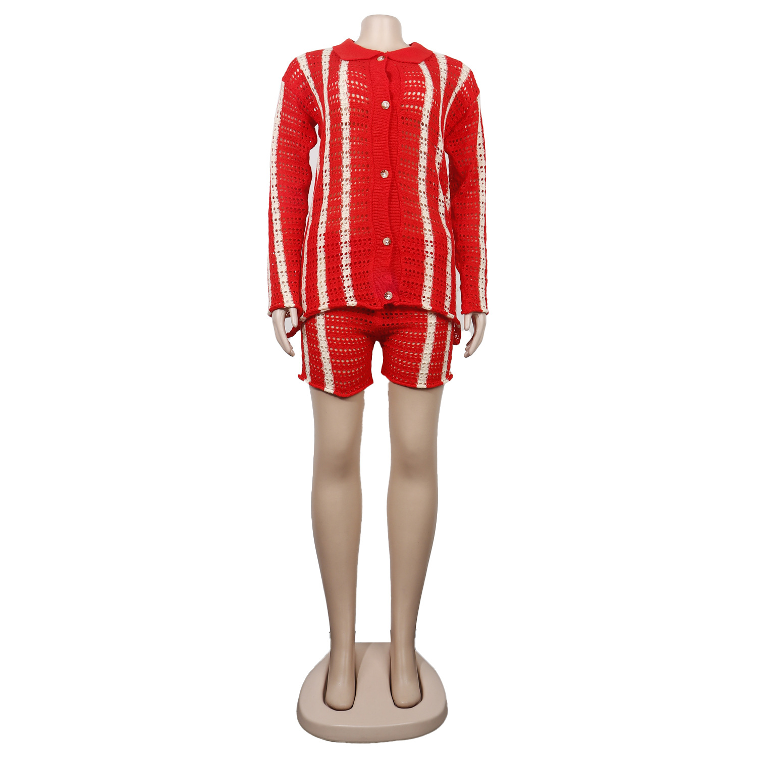 High Collared Slim Cardigan Button Stripe Two Piece Sweater