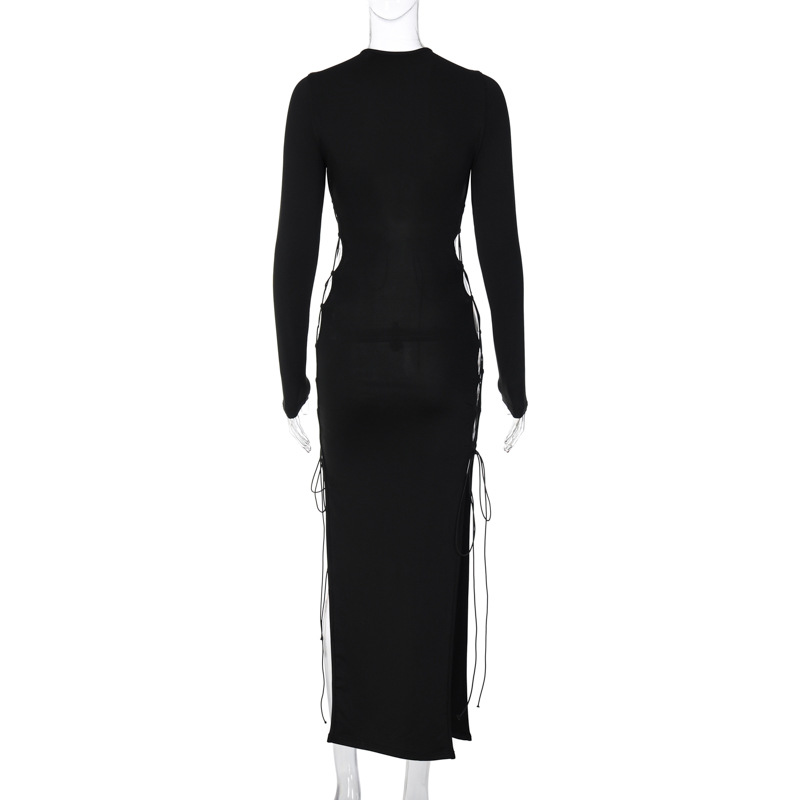 Hollow Out Cutout out Tied Slim Fit Slit Long Sleeve Dress
