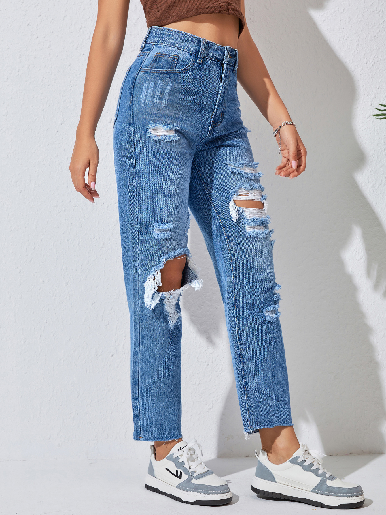 Jeans Straight Ripped Trousers Frayed Street Denim