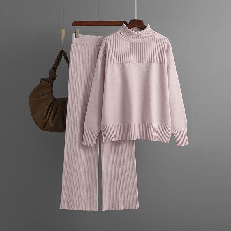 Knitted Pullover Solid Color High Collar Loose Casual Sweater Two Piece Set