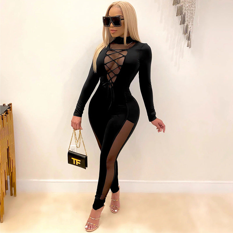 Lace Up Stitching See Through Long Sleeve Jumpsuit