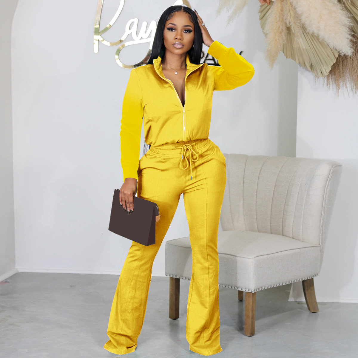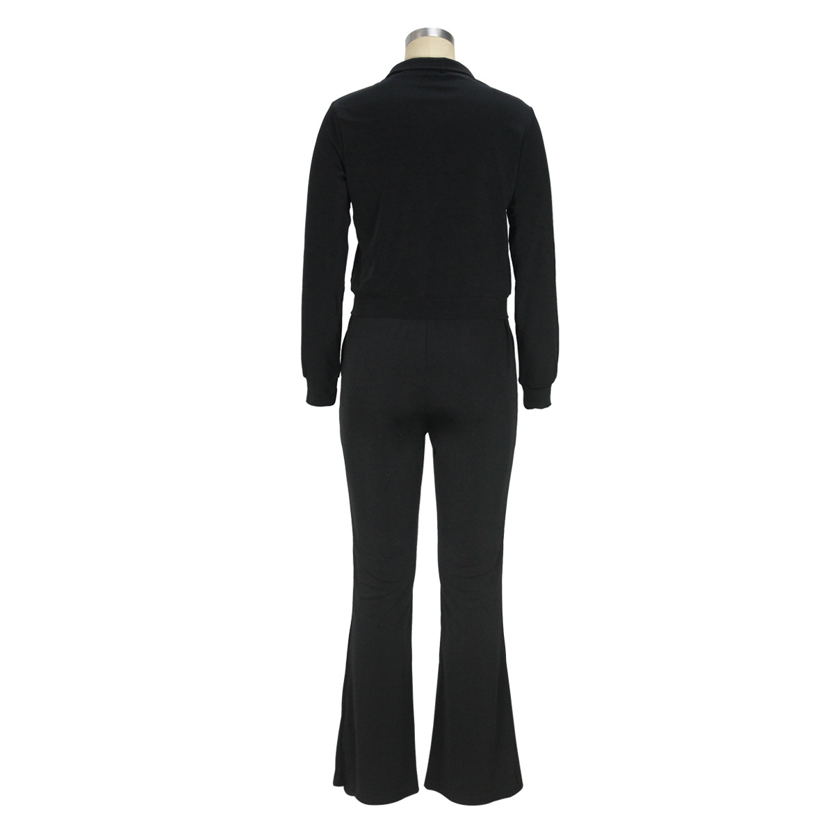 Long Sleeves Zipper Top Bell Bottom Pants Suit Casual Two Piece Suit