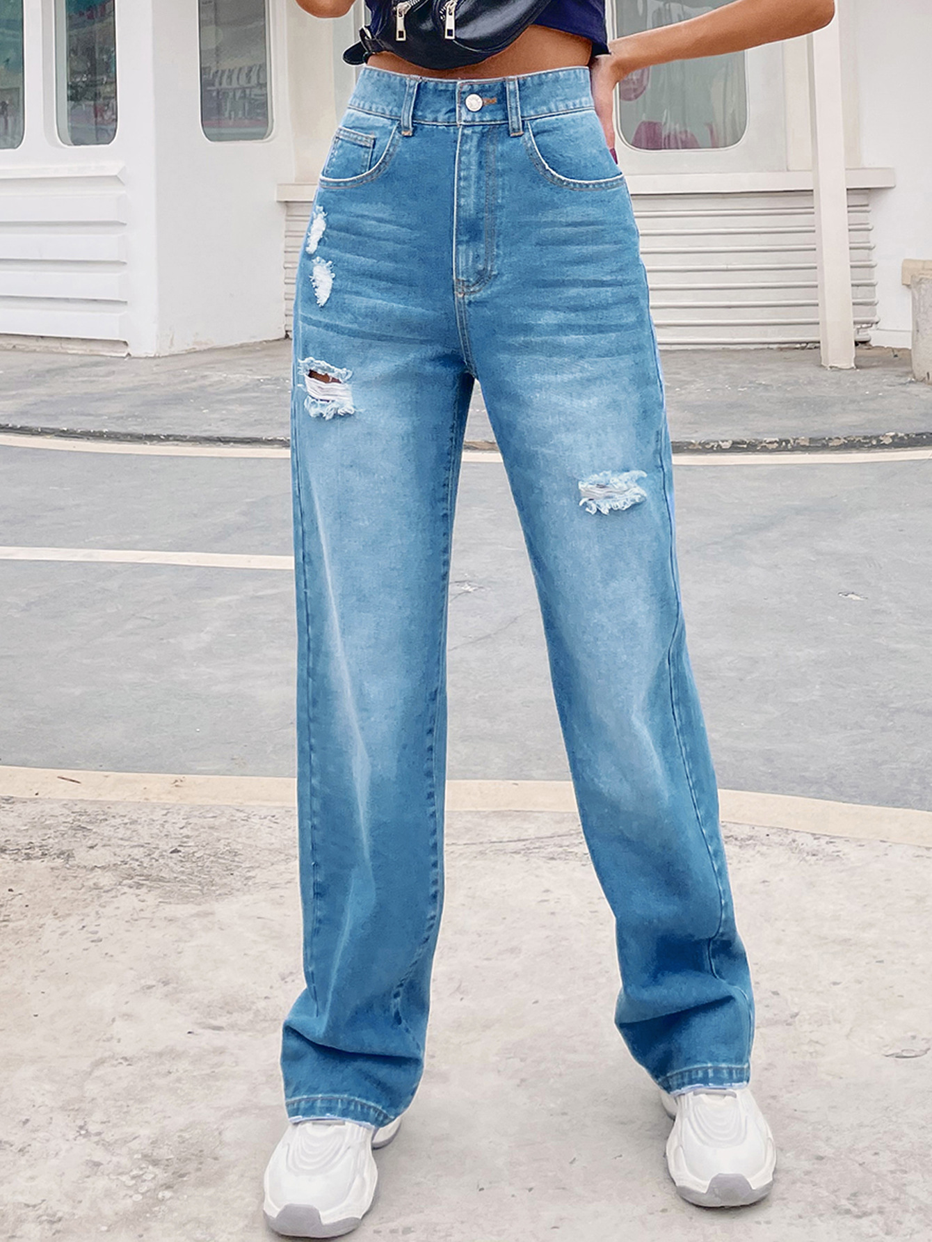 Loose High Waist Mopping Ripped Denim Trousers