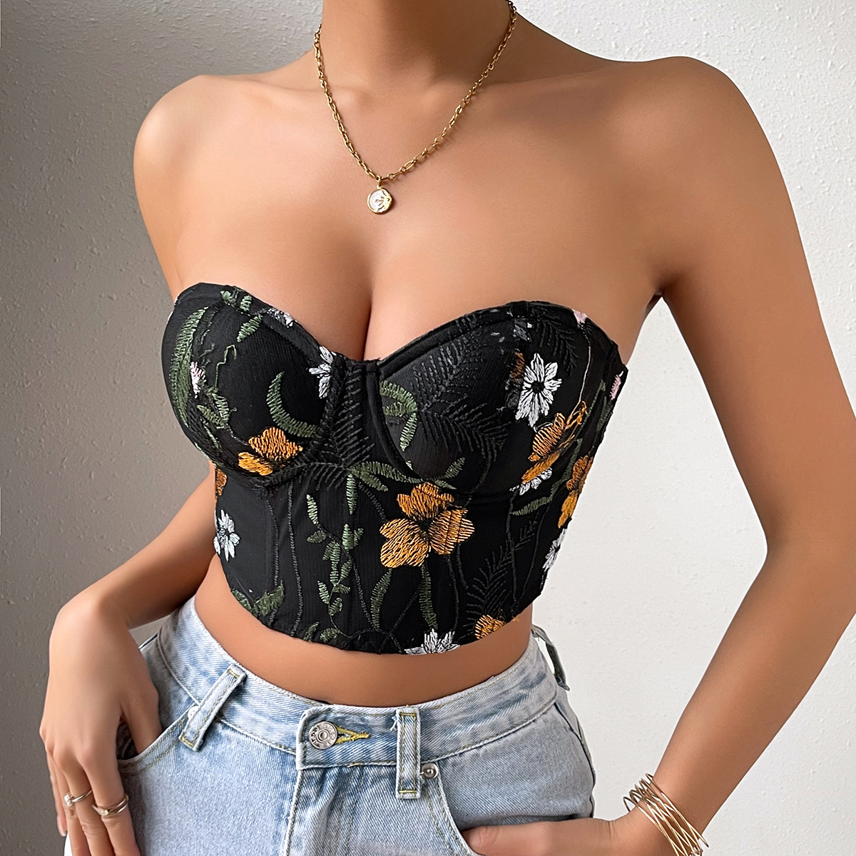 Low Cut Cropped Embroidery Short Top Chest Cotton Steel Ring Vest