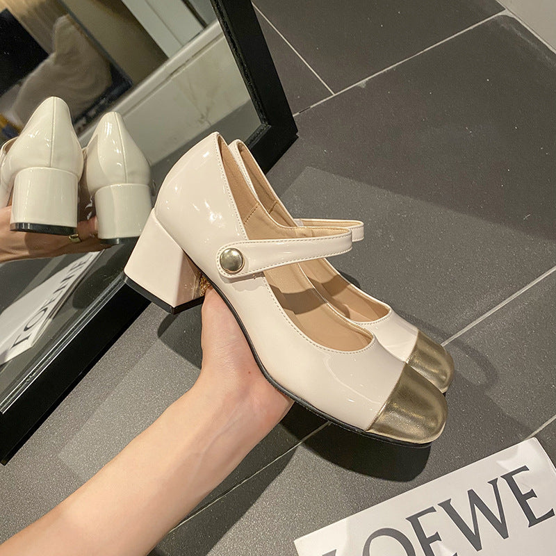 Fashion Element: Shallow Mouth. Thick Heel. Color Matching. Belt Buckle
