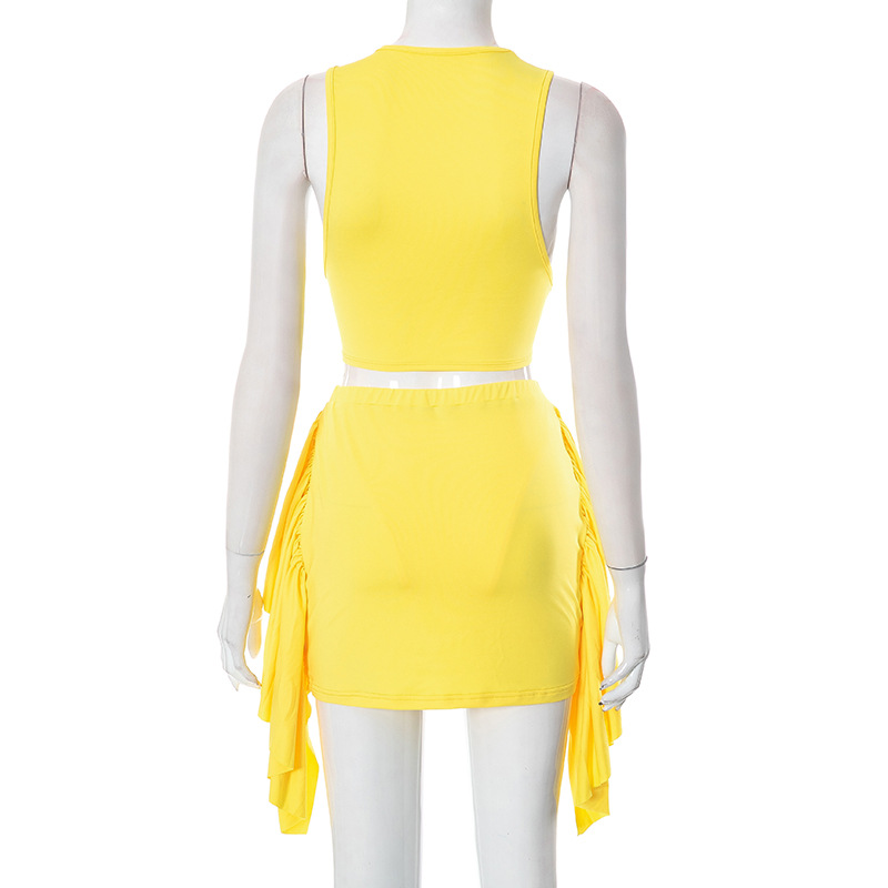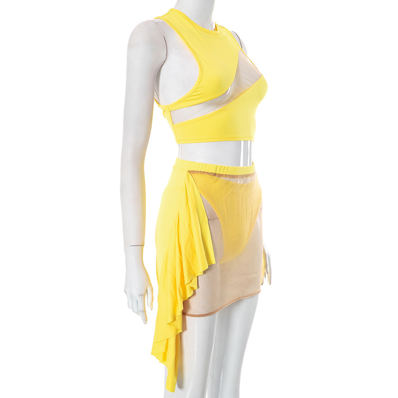 Mesh See through Skirt Set Hollow Out Cutout out Stitching Top Three Piece Skirt Sets