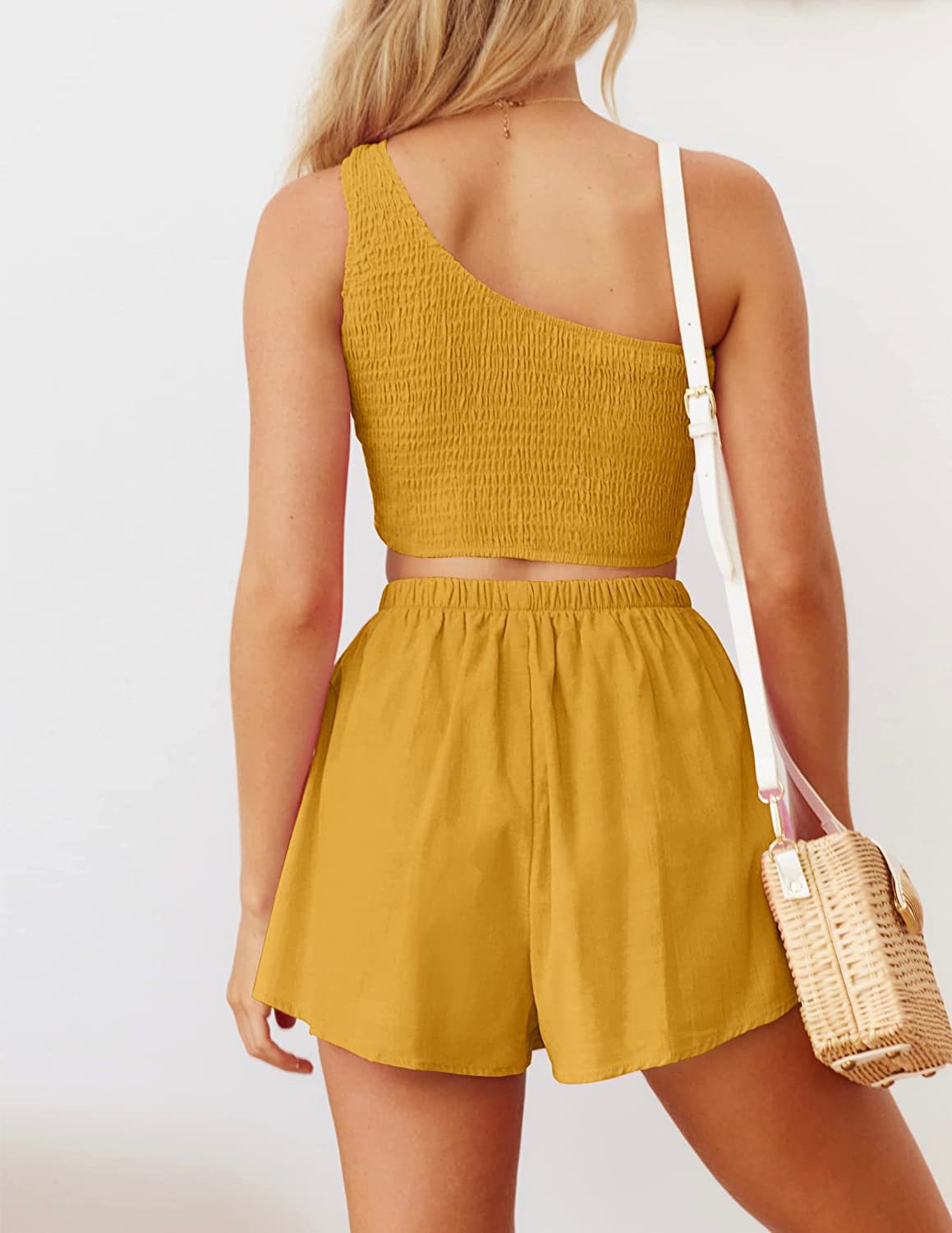 One Shoulder Pleated Cropped Top Shorts Beach Two Piece Suit