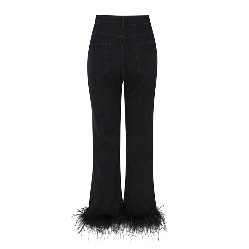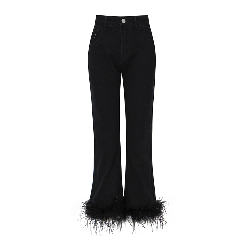 Ostrich Feather Stitching Straight Leg Pants High Waist Western All-Matching Slimming Casual Jeans