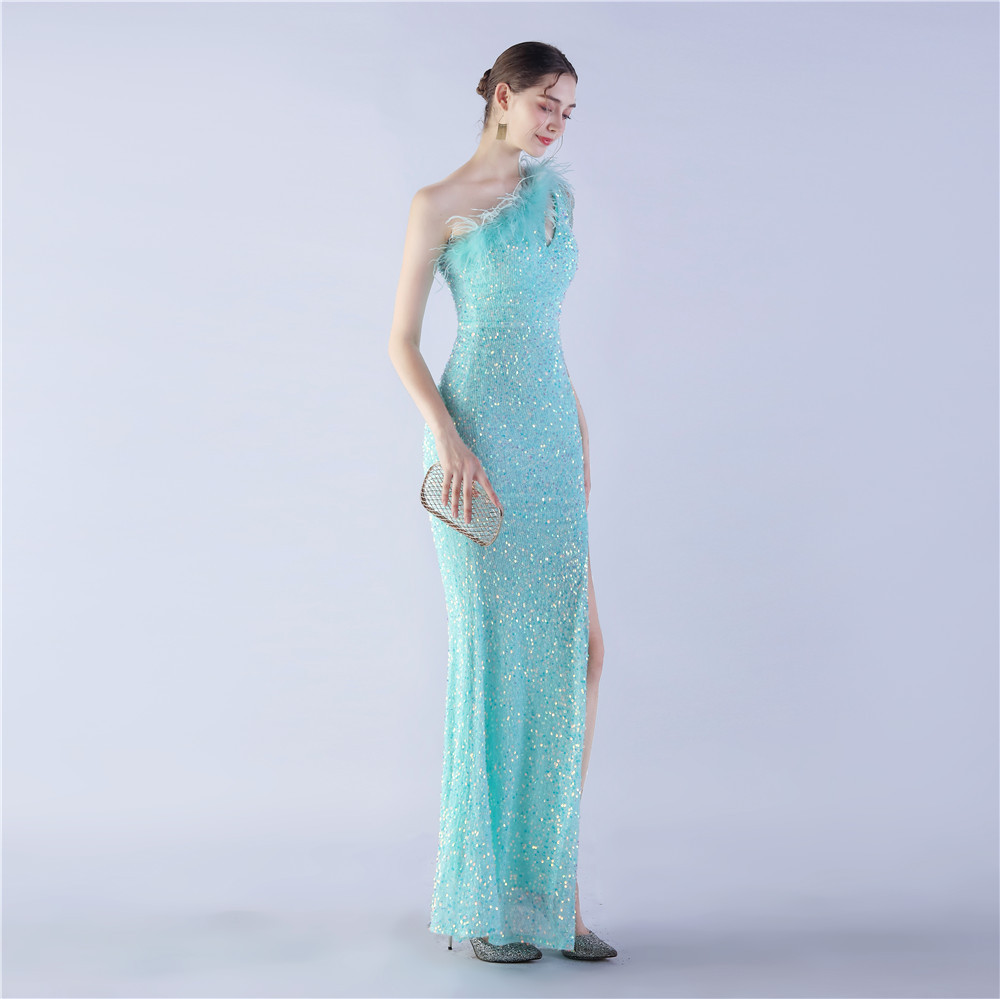 Ostrich Hair Craft Oblique Shoulder Side Slit High End Evening Dress