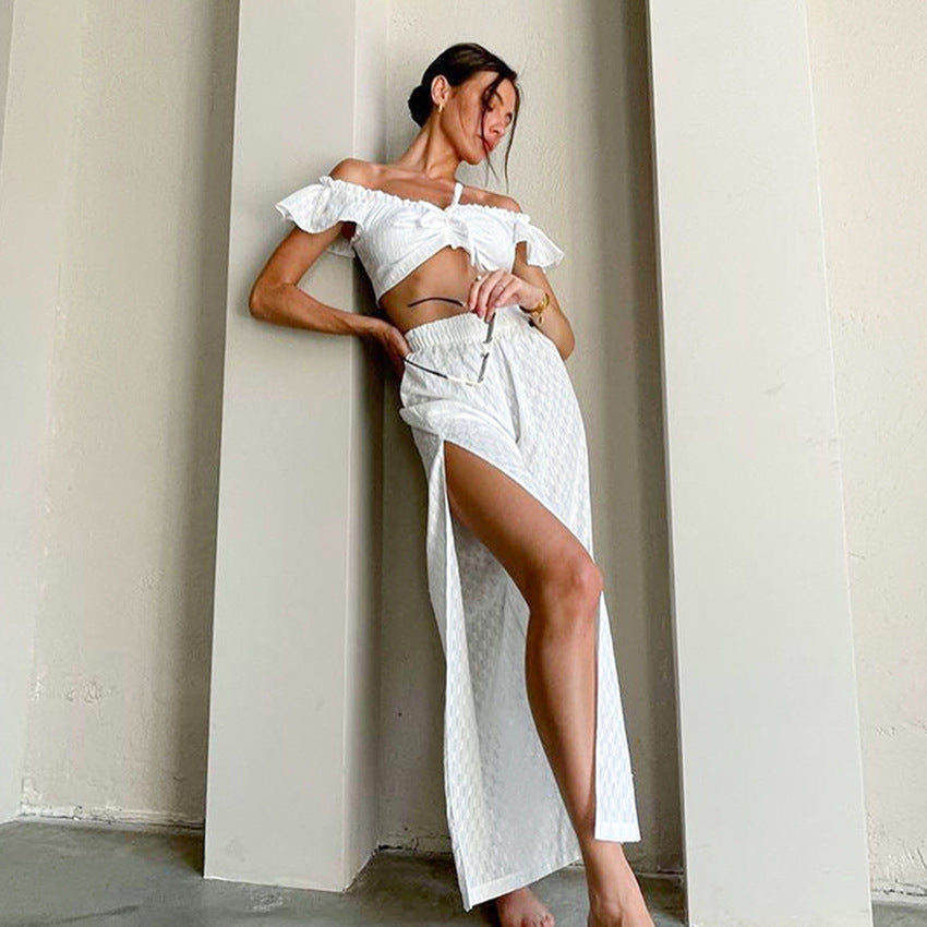 Pants Set Ruffled Stitching Flying Sleeves Jacquard Slit