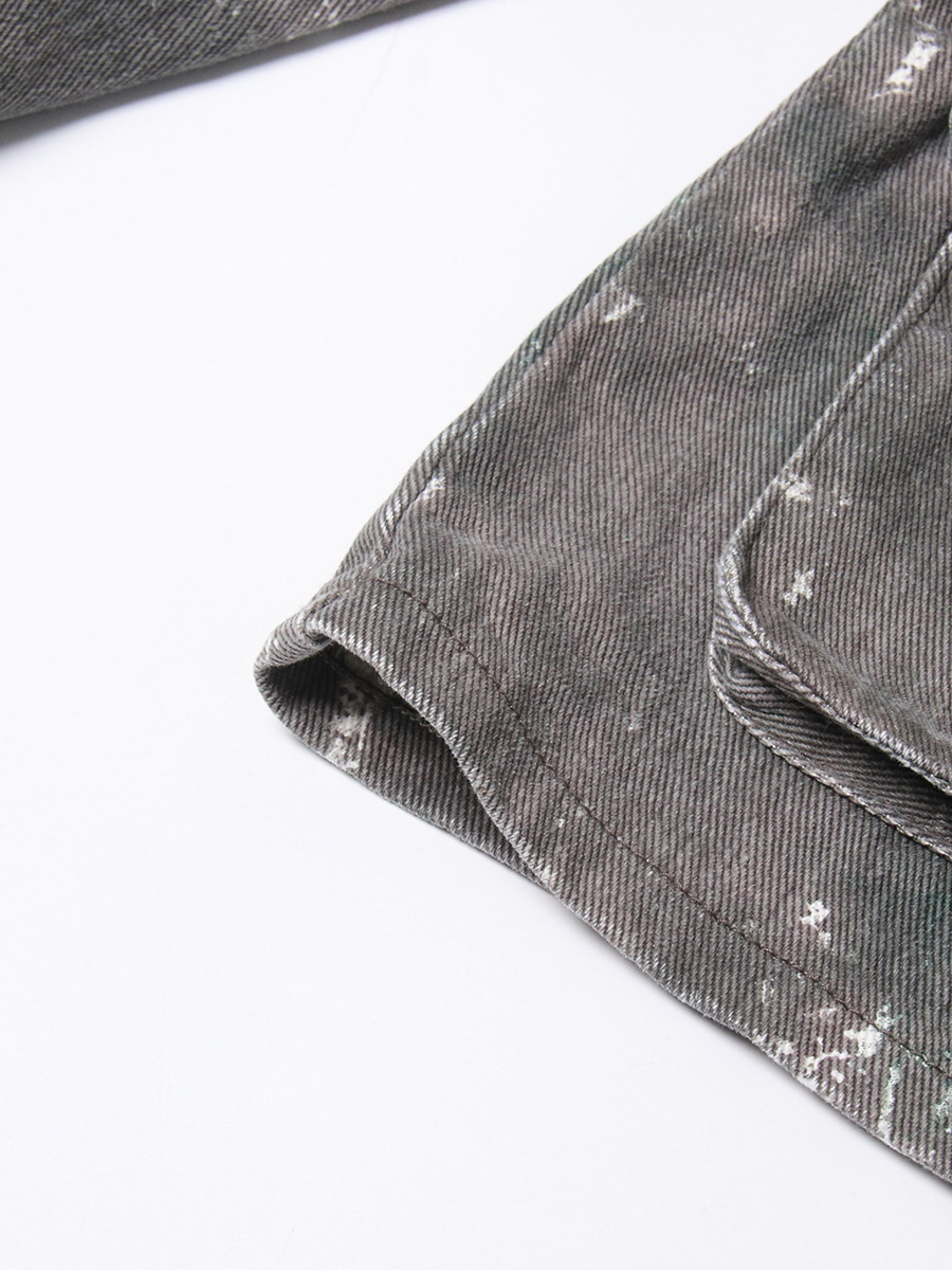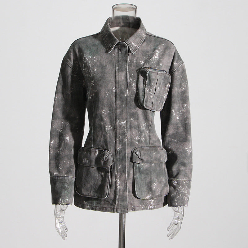 Personalized Samouflage Three Dimensional Large Pocket Lapels Waist Tooling Denim Jacket Long Sleeved Coat