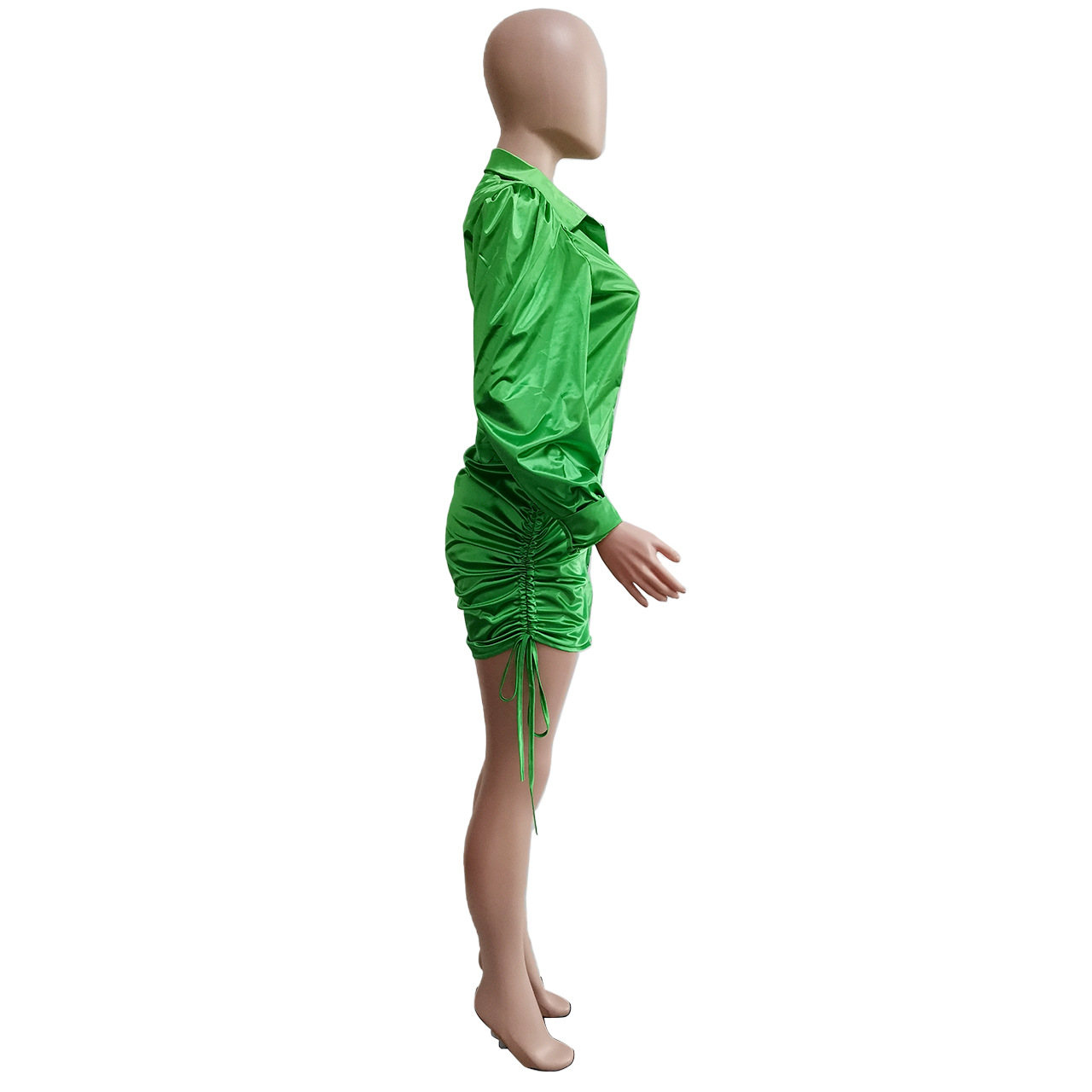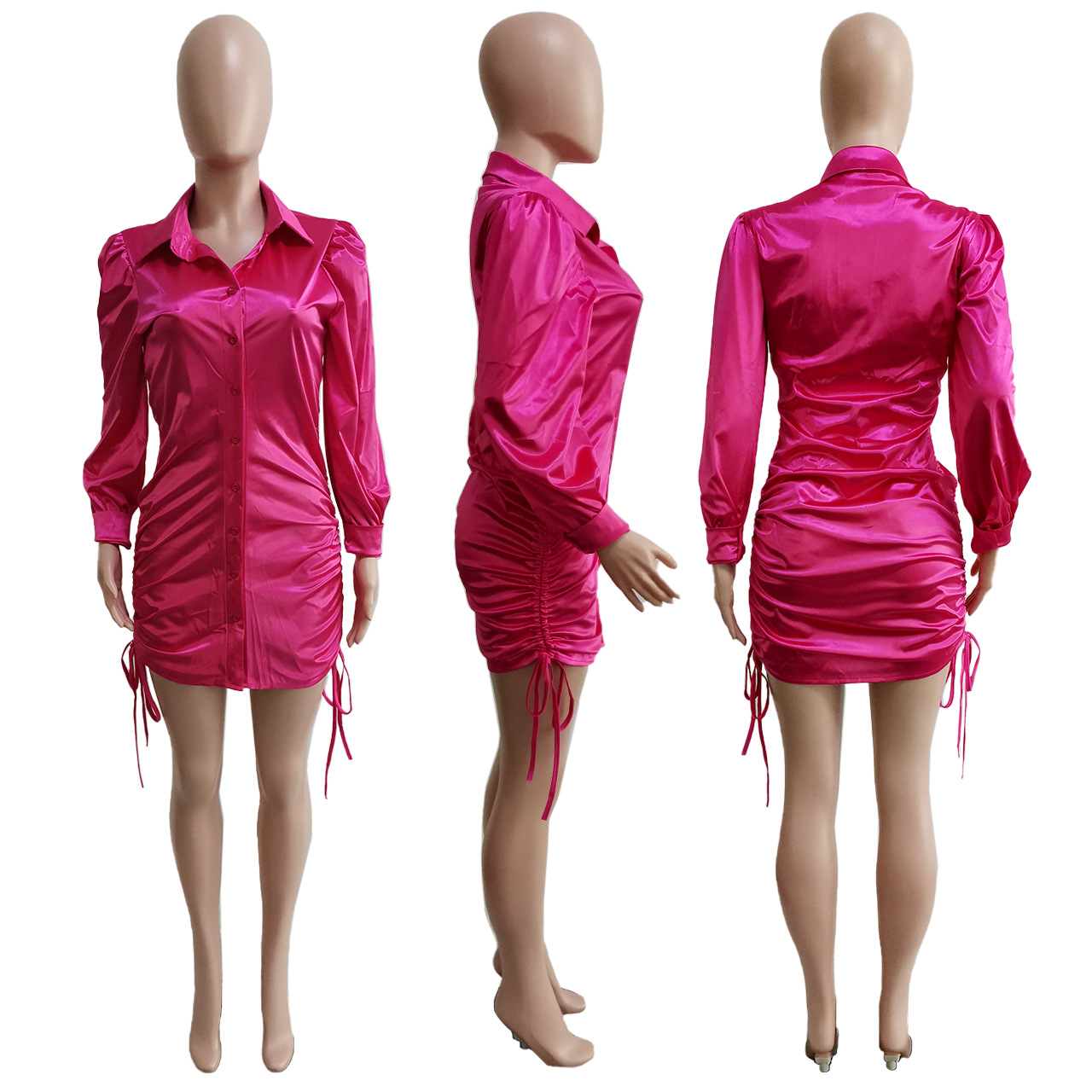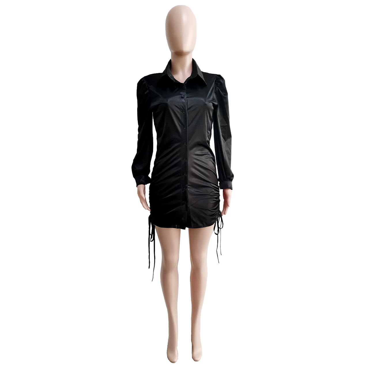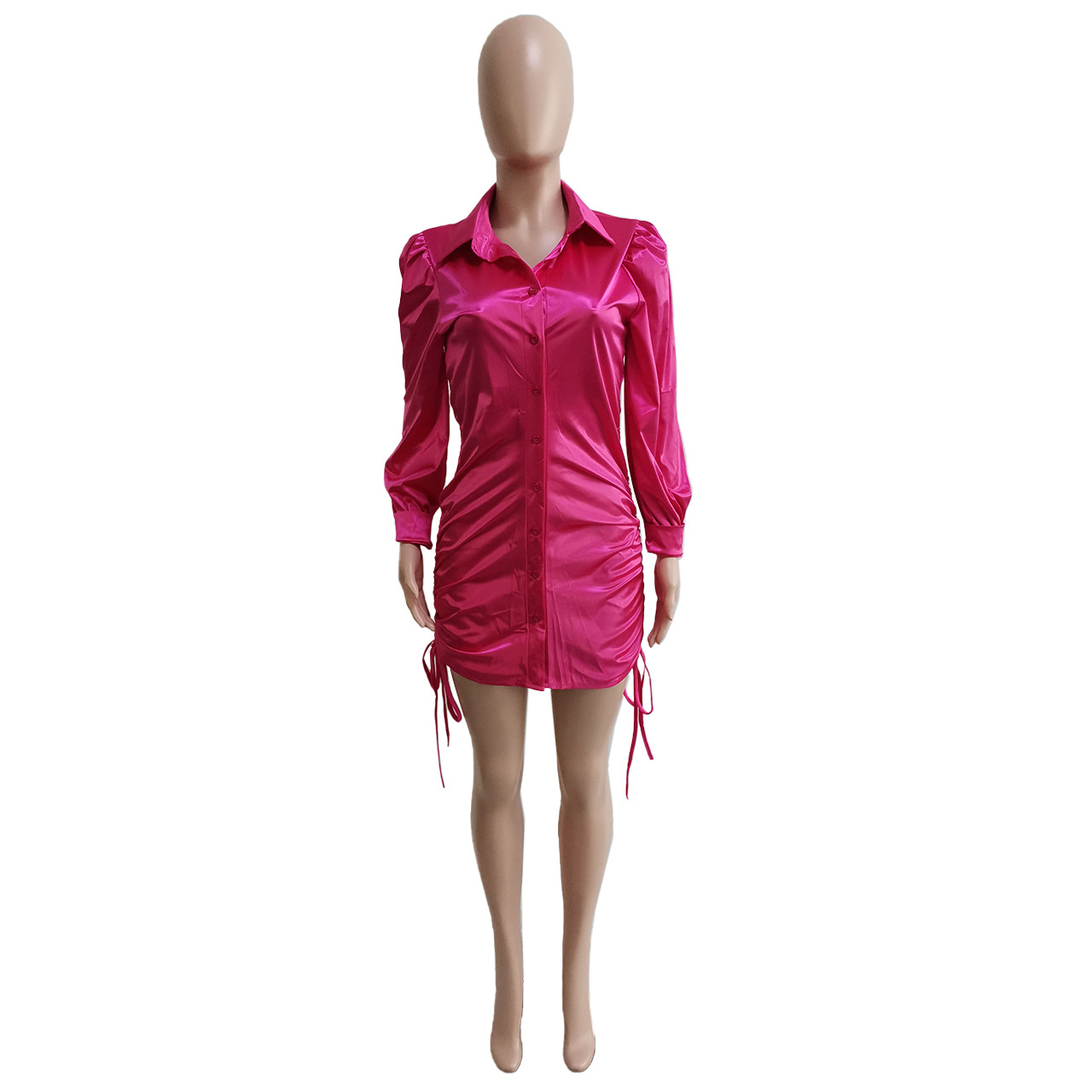 Pleated Lace up Loose Elastic Mid Length Shirt Dress