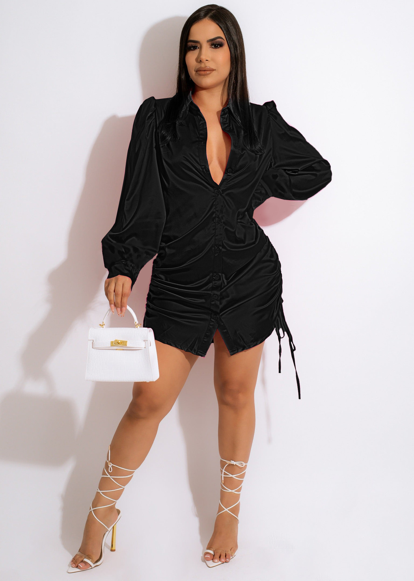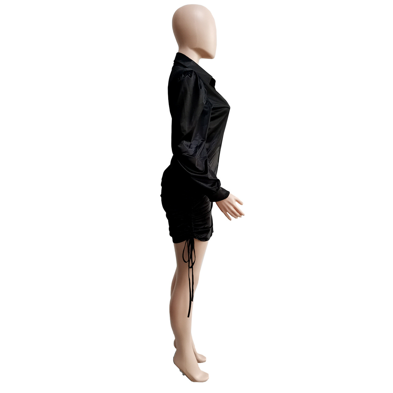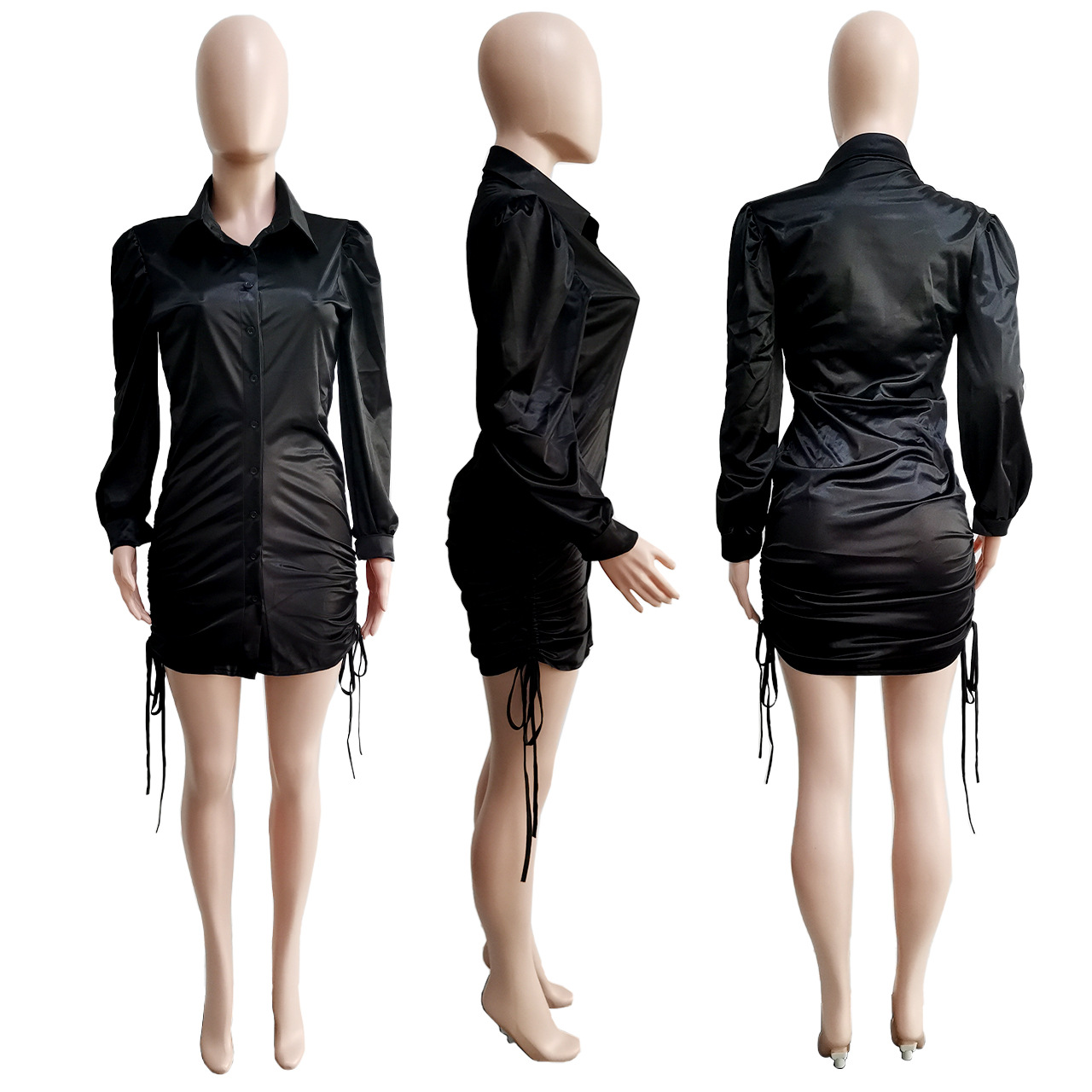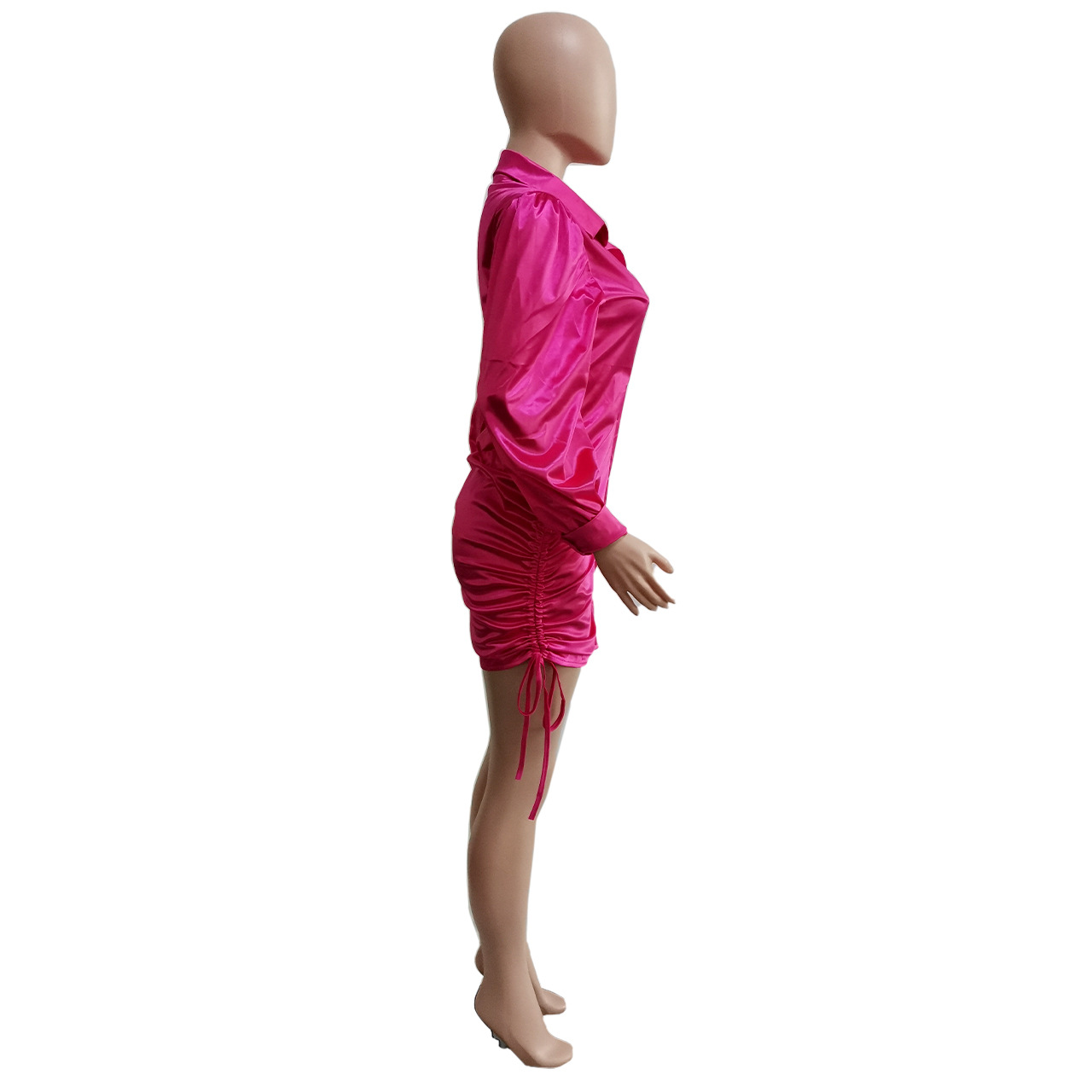 Pleated Lace up Loose Elastic Mid Length Shirt Dress