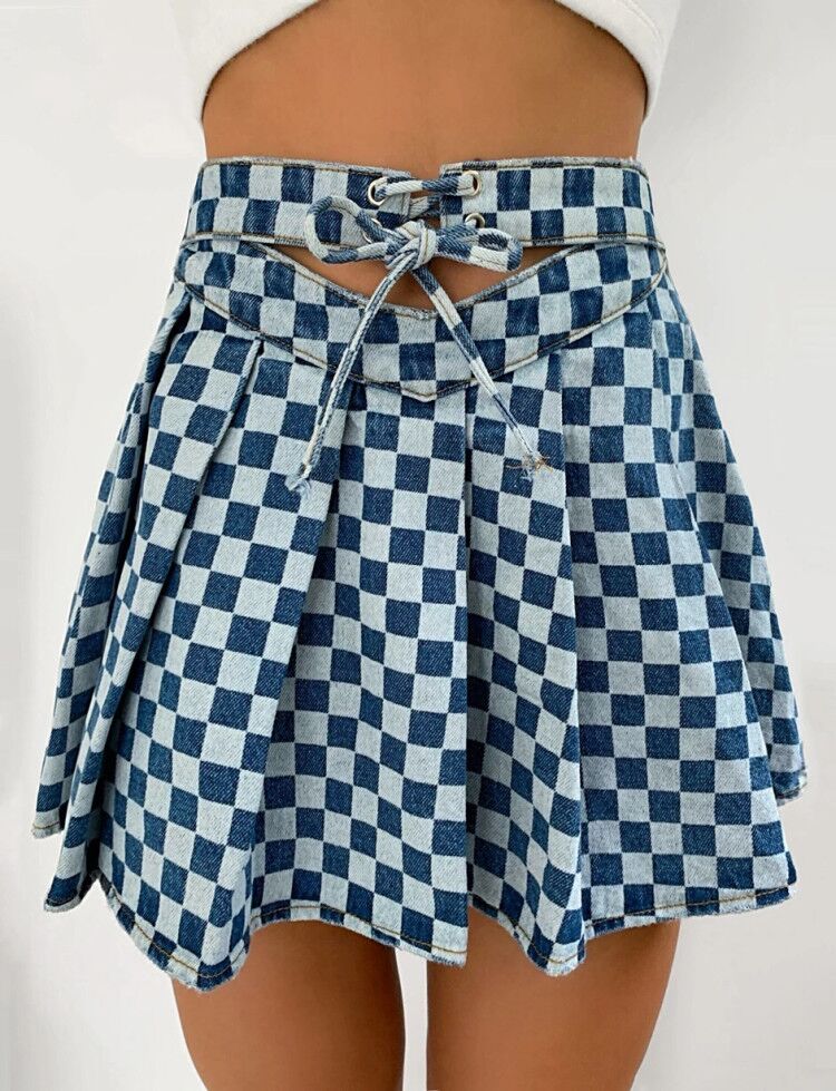 Pleated Skirt Denim Skirt Hollow Out Cutout High Waist Tie Neck Plaid Printed Short Skirt