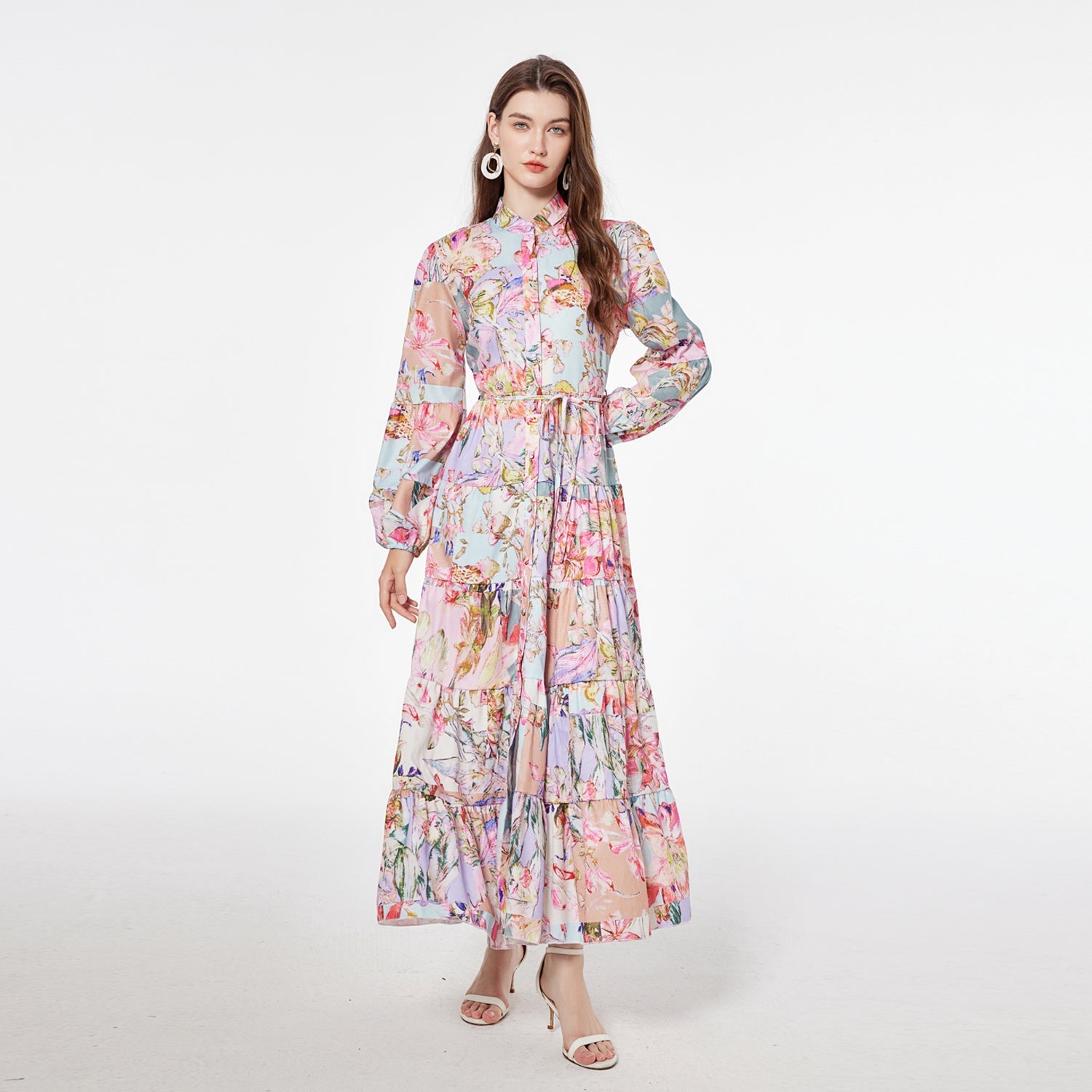 Printed Single Breasted Looseeign Trade Dress Lace Up Vacation Style Retro Long Dress