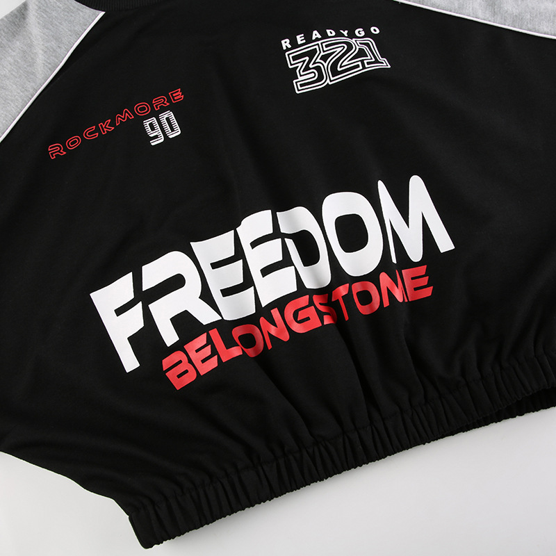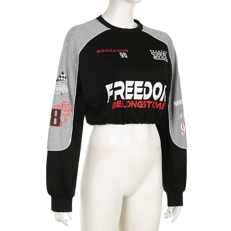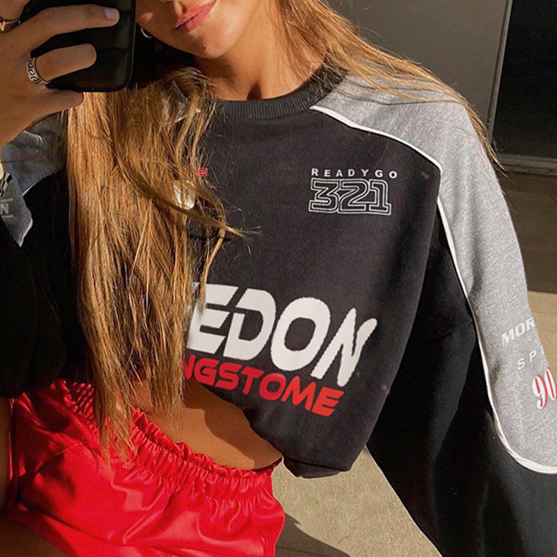 Racing Car Letter Graphic Printing Machine Car round Neck Sweater Contrast Color Loose Personality Short Top