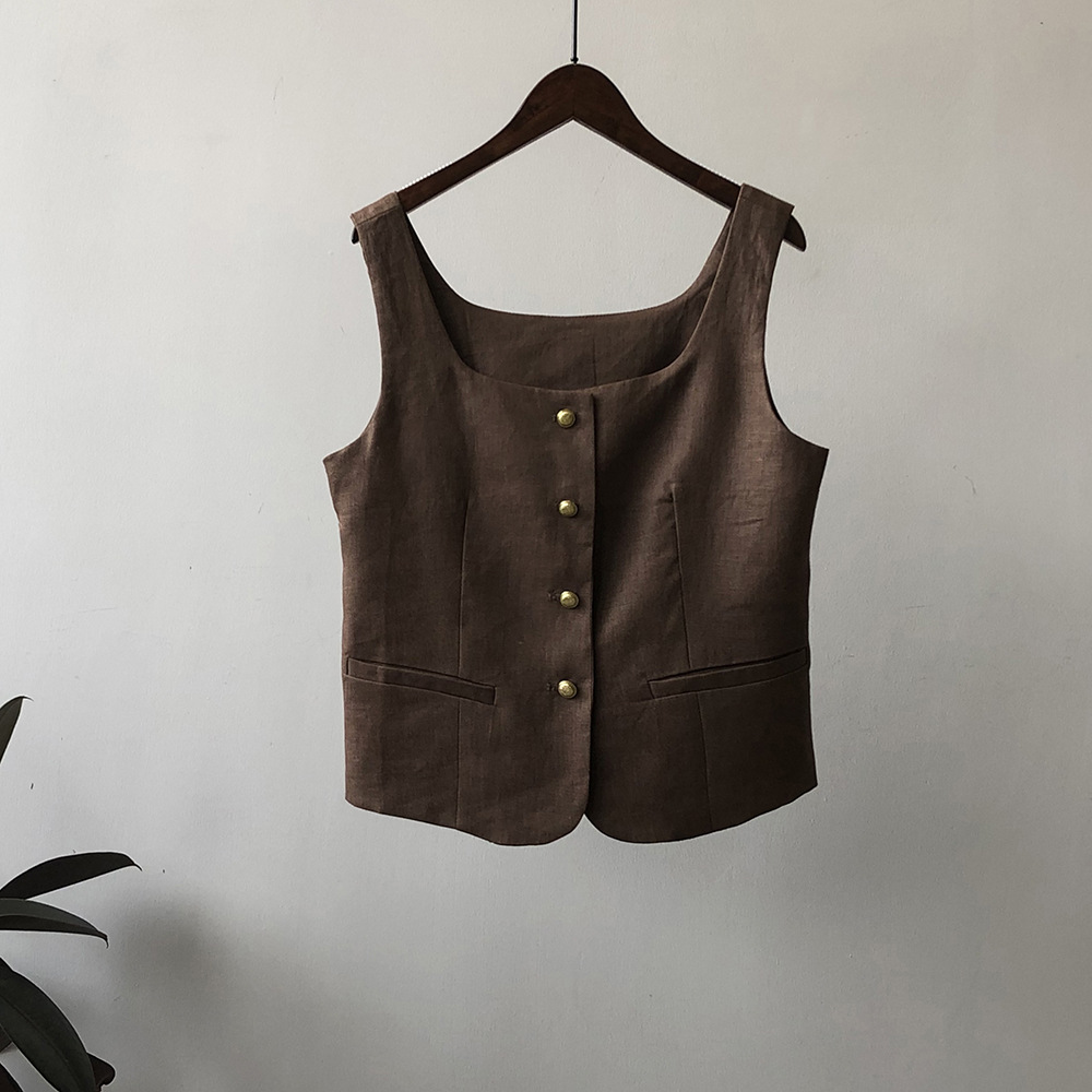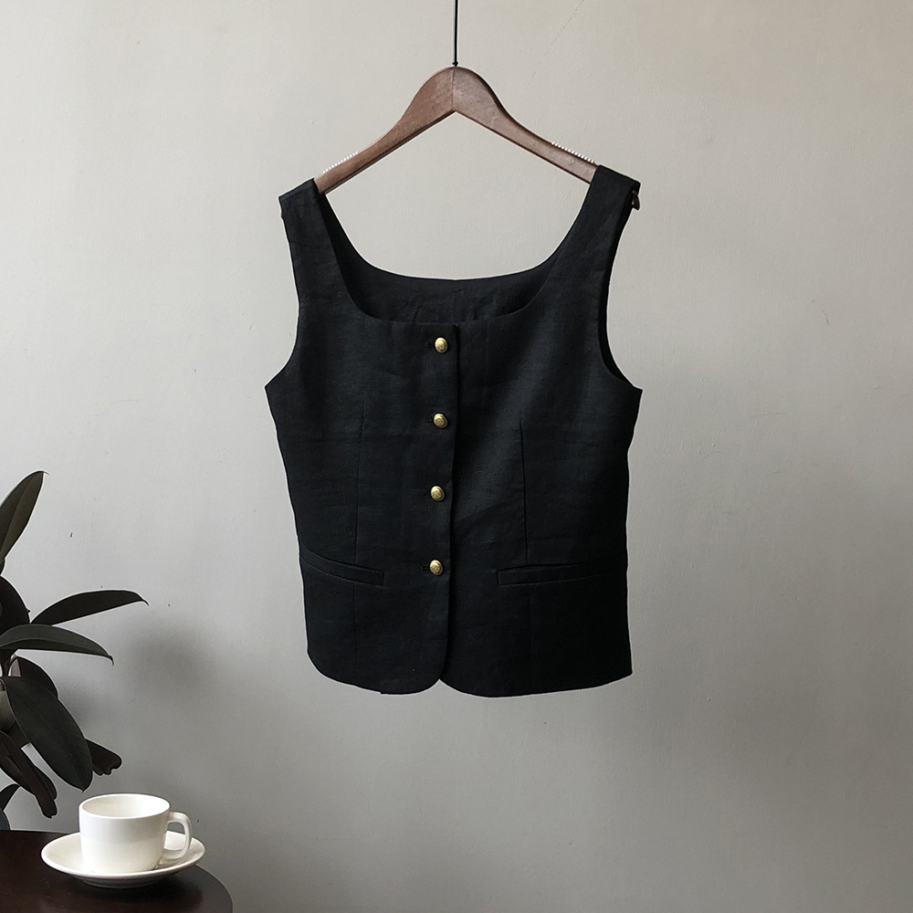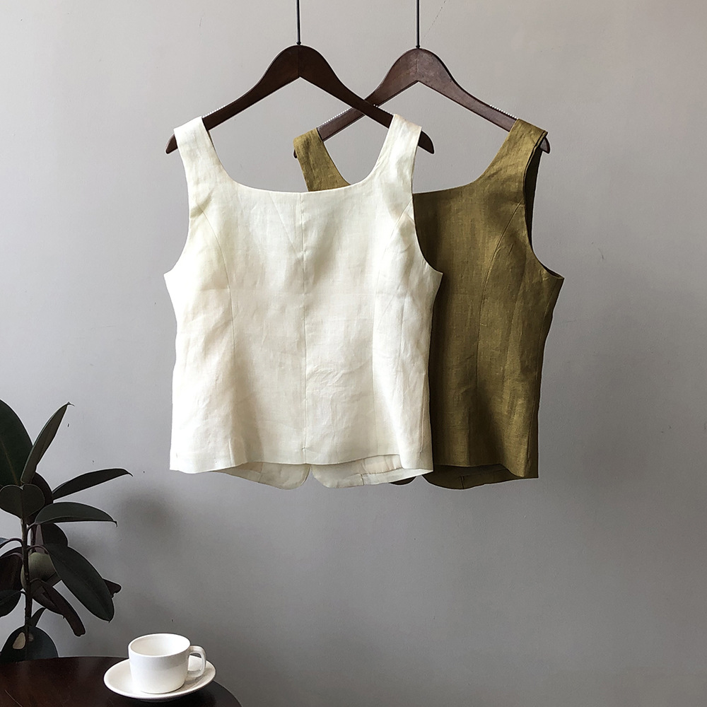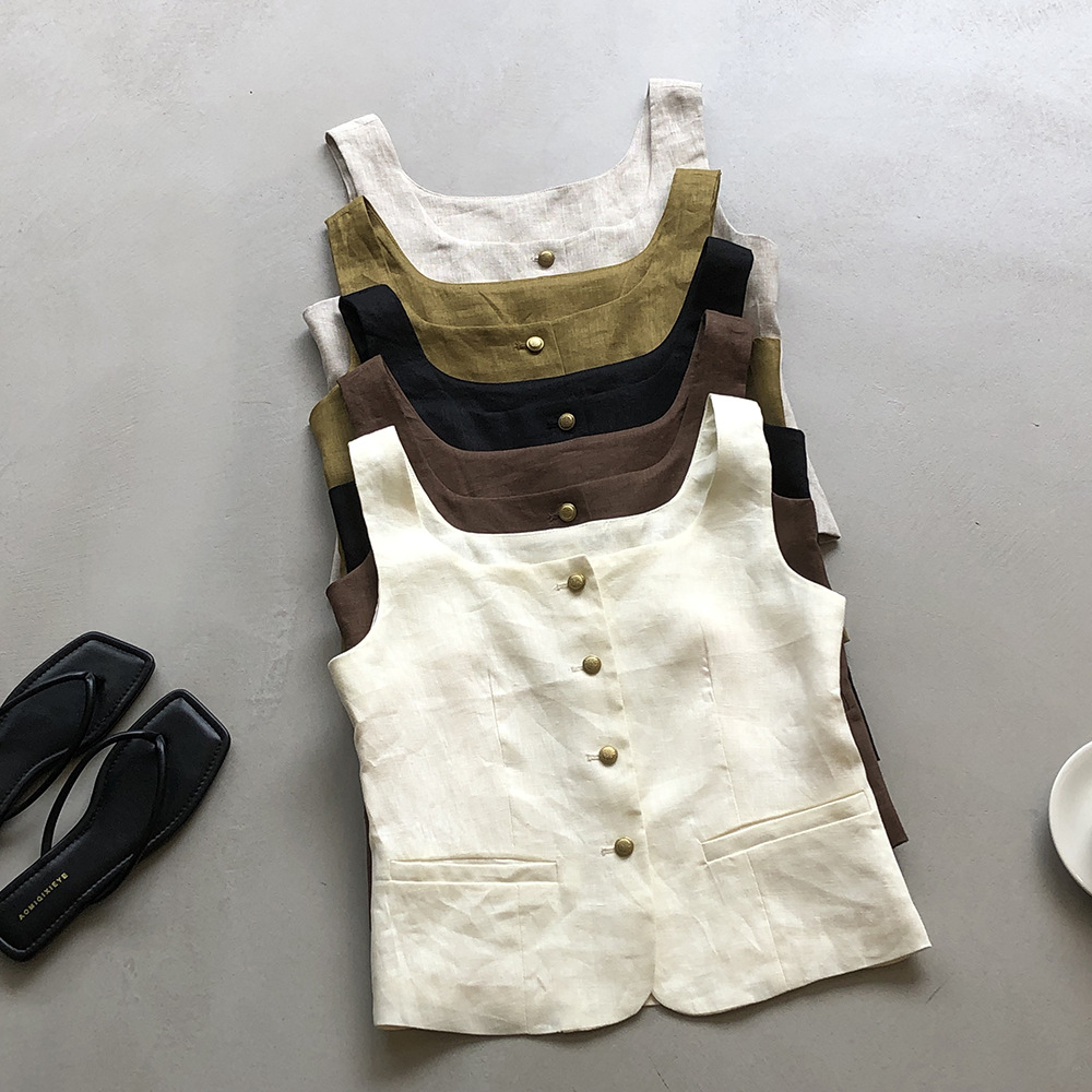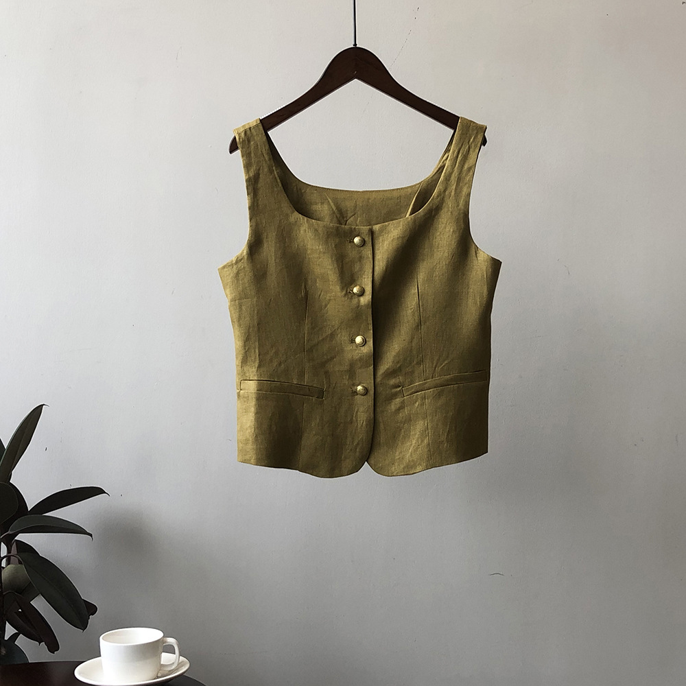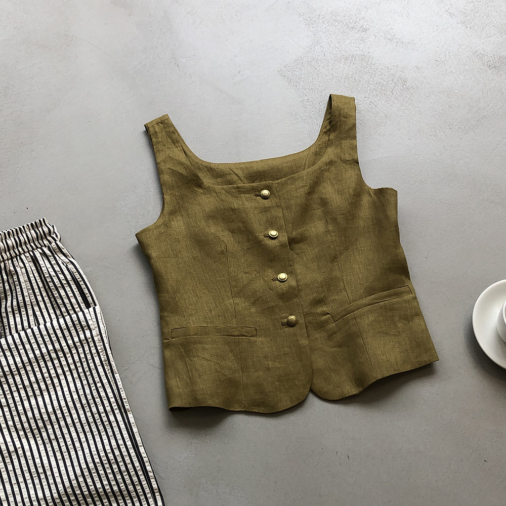 Retro Linen Vest-Interest Square Collar Sleeveless Short Top