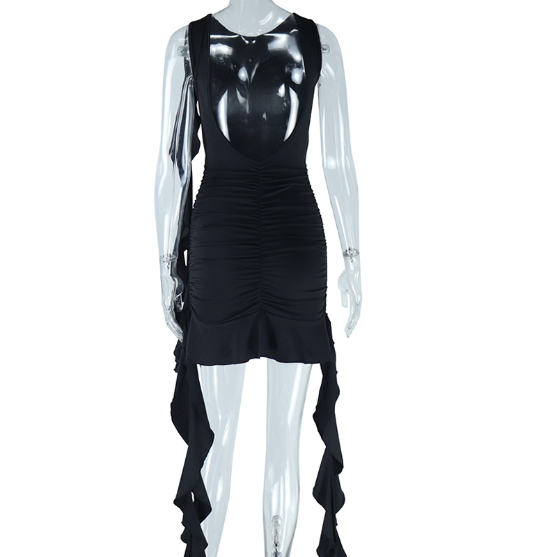 Round Neck Sleeveless Backless Ribbon Hip Wrapped Ruffled Dress