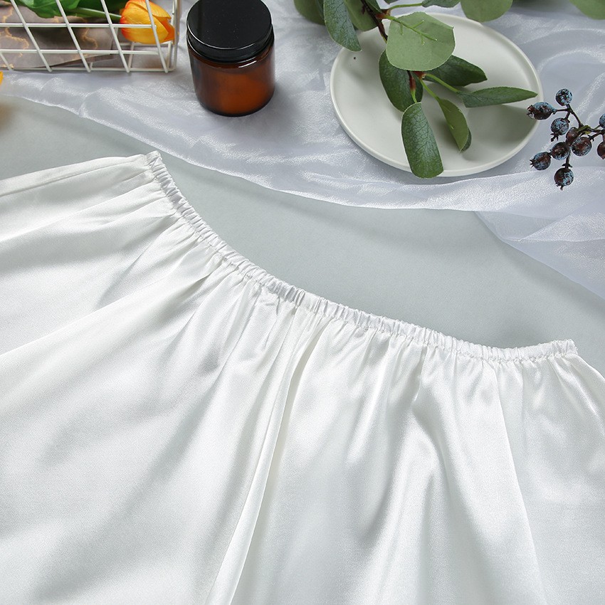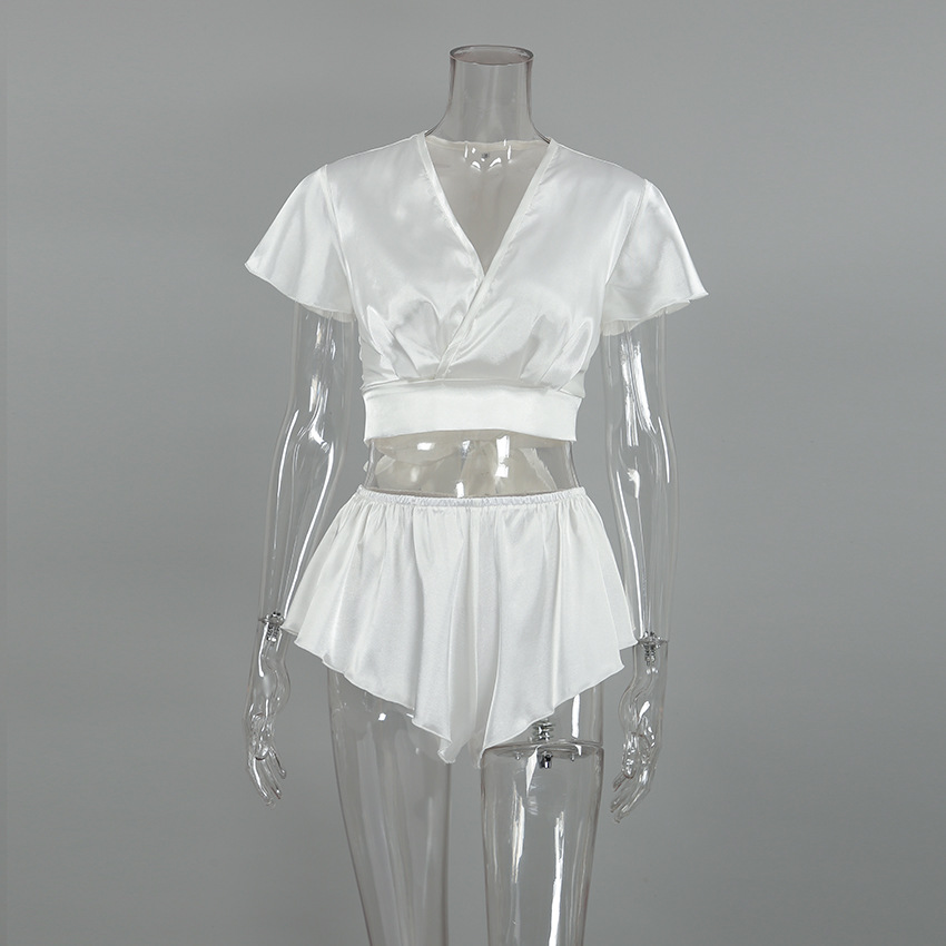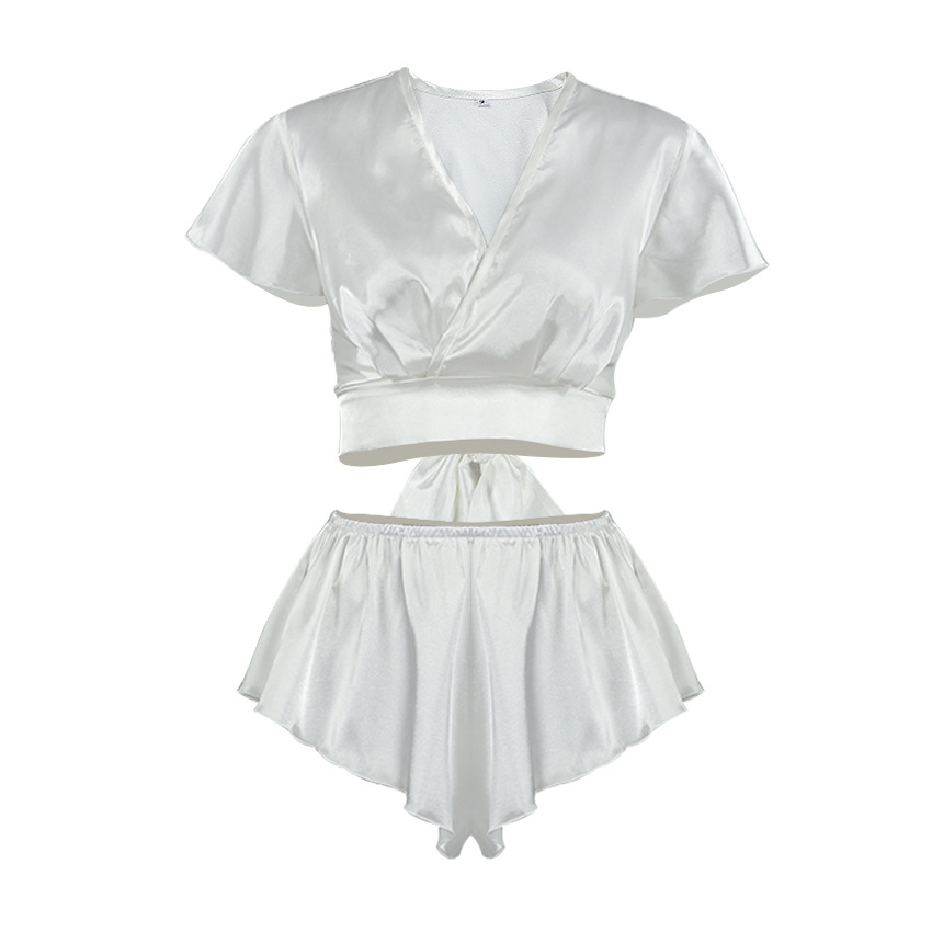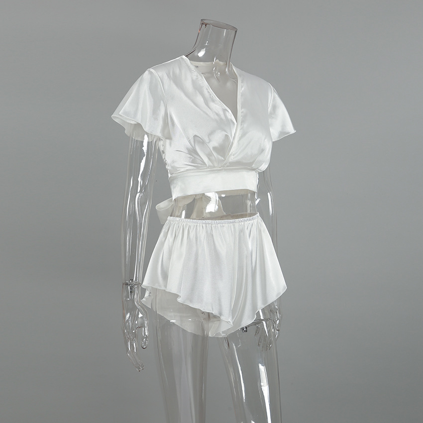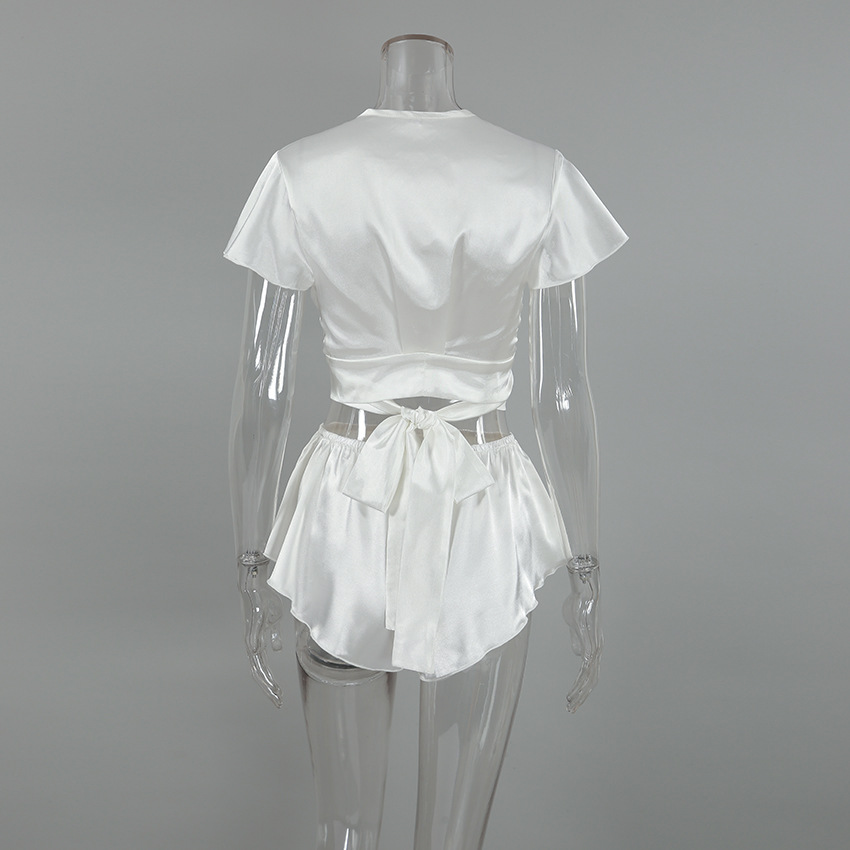 Satin Solid Color Pajamas Two Piece Lotus Edge Short Sleeved Pantskirt Lace up Home Wear