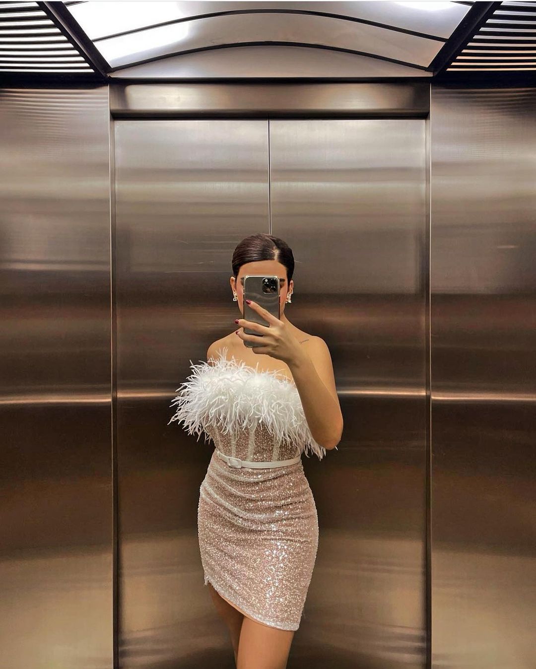 Short High Waist Sequ Dress off Shoulder Feather Dress