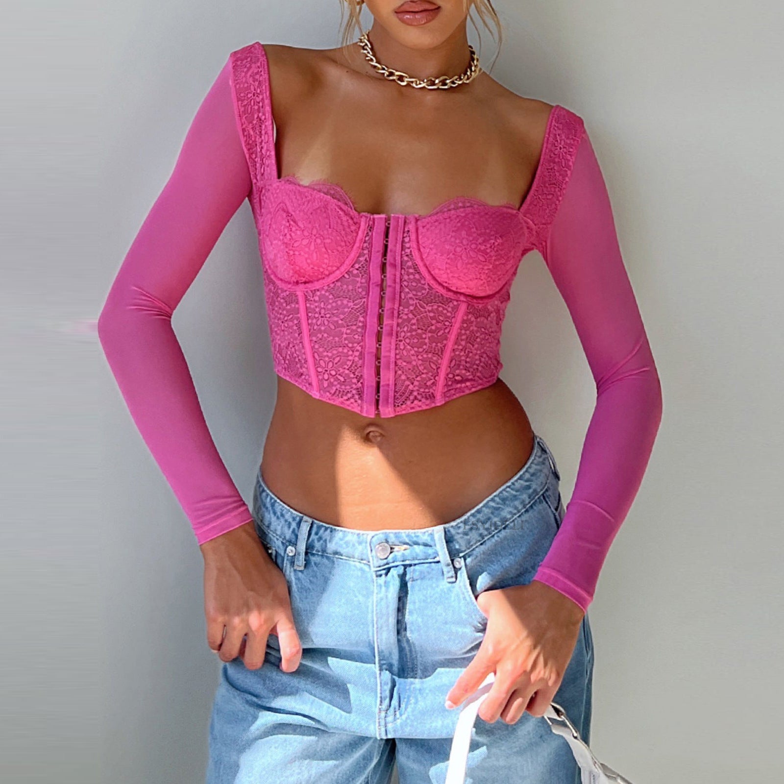 Slim Lace Boning Corset Long Sleeve Square Cut Collar Short Top