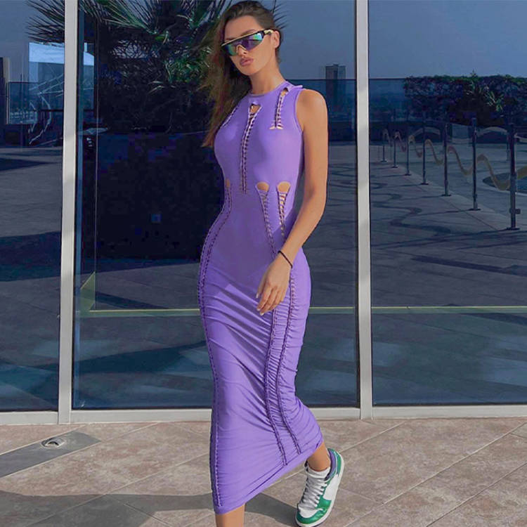 Solid Color Hollow Out Cutout Slim round Neck Sleeveless Dress