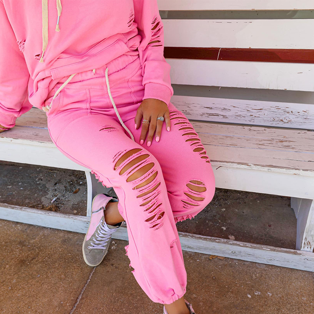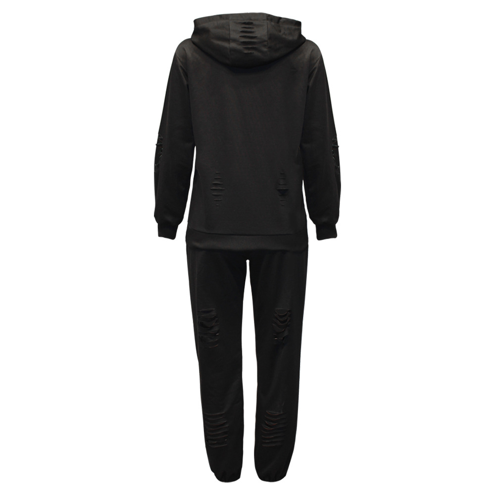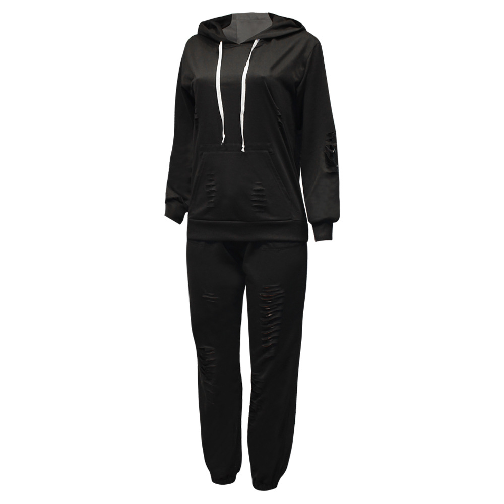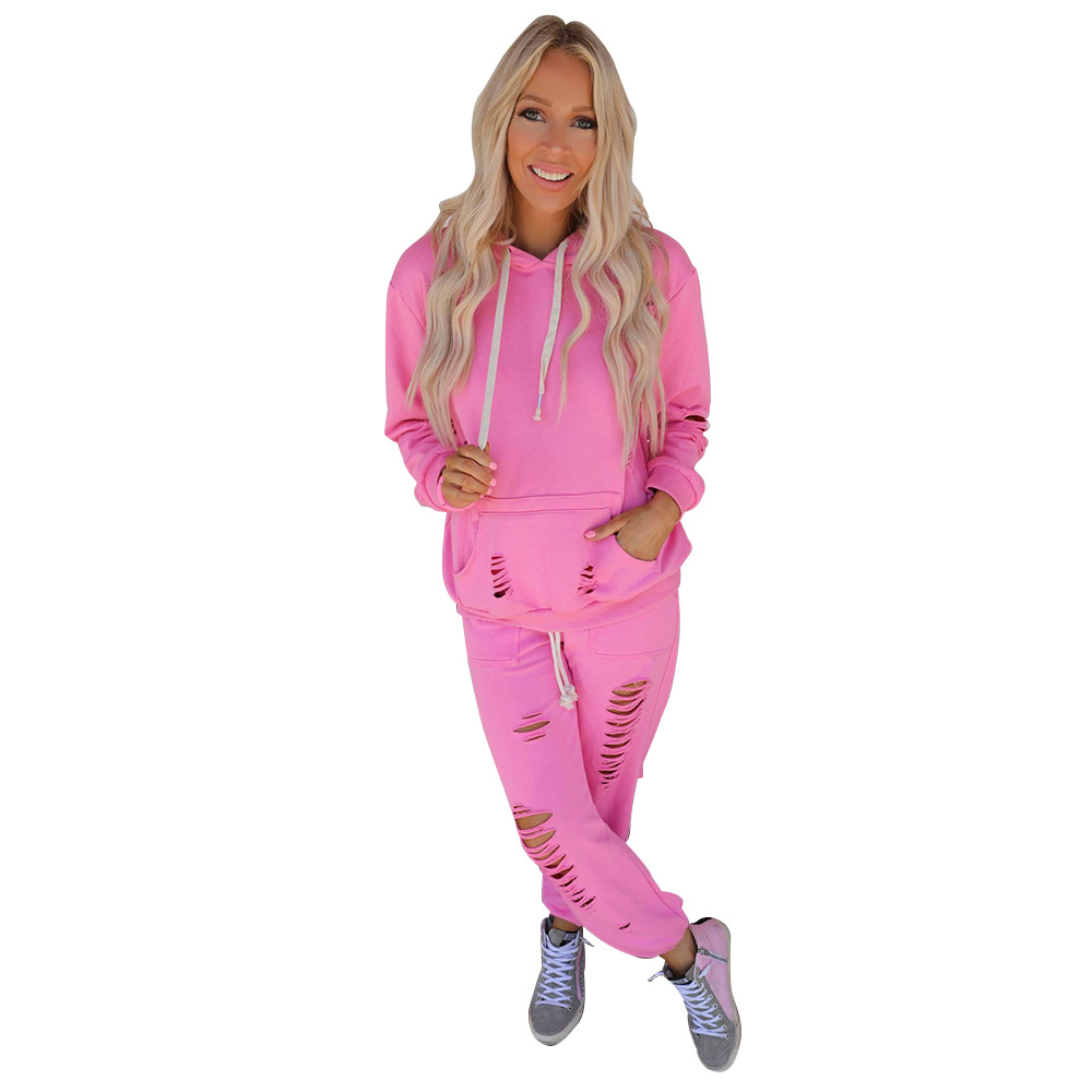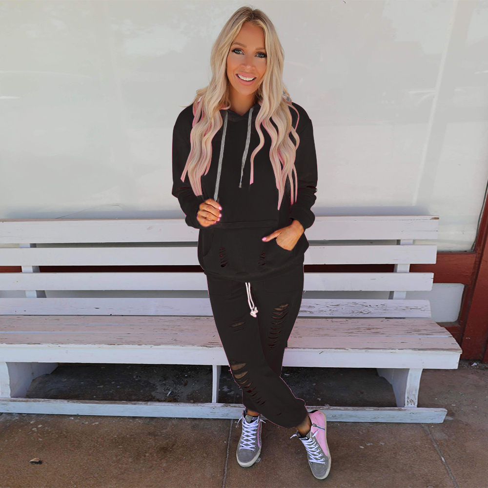 Solid Color Hooded Long Sleeve Ripped Loose Casual Suit