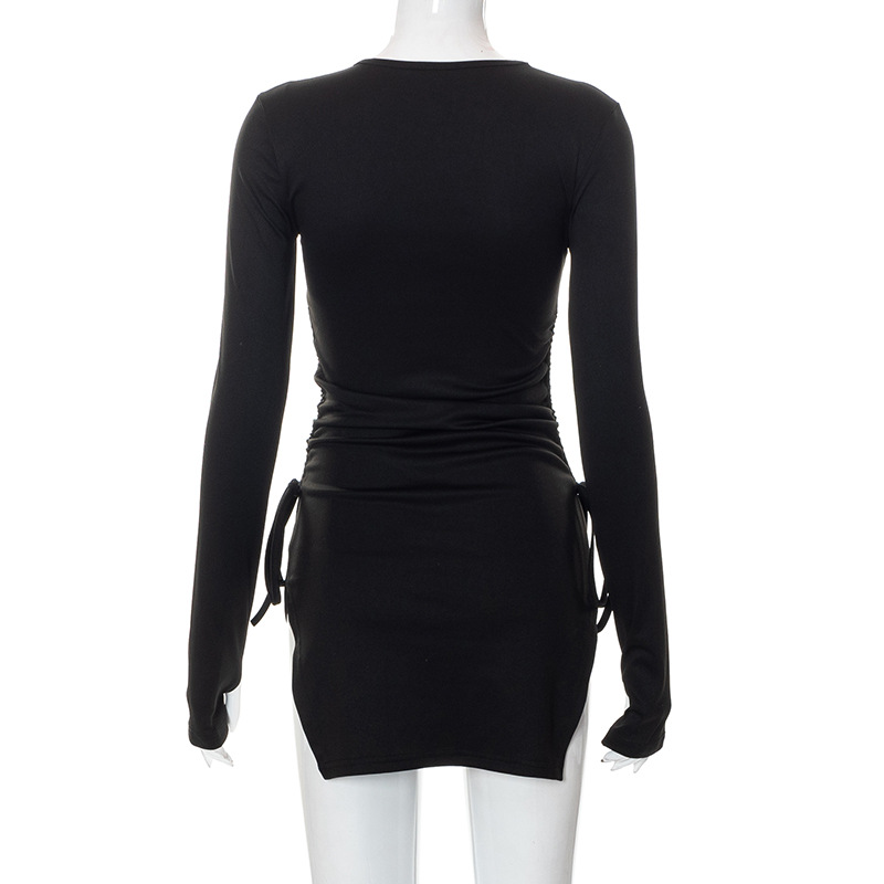 Solid Color round Neck Pullover Long Sleeve Self Tie Slit Dress