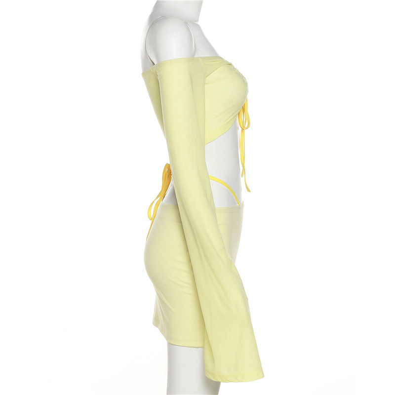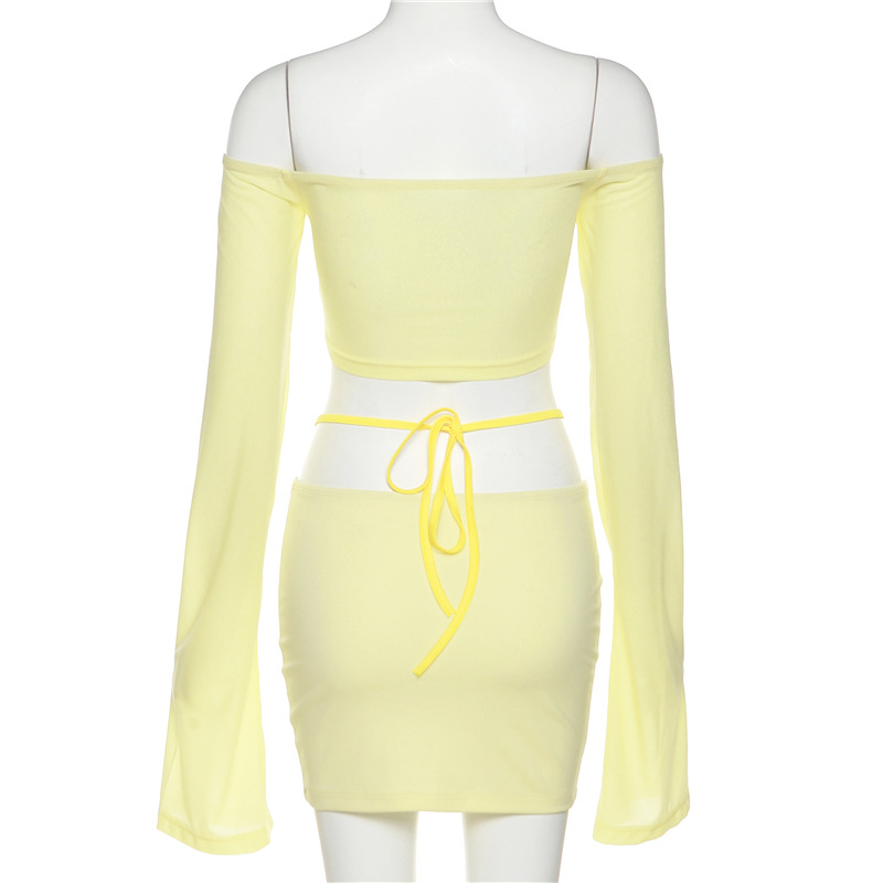 Solid Color Slim Fit Off Shoulder Long Sleeve Skirt Set