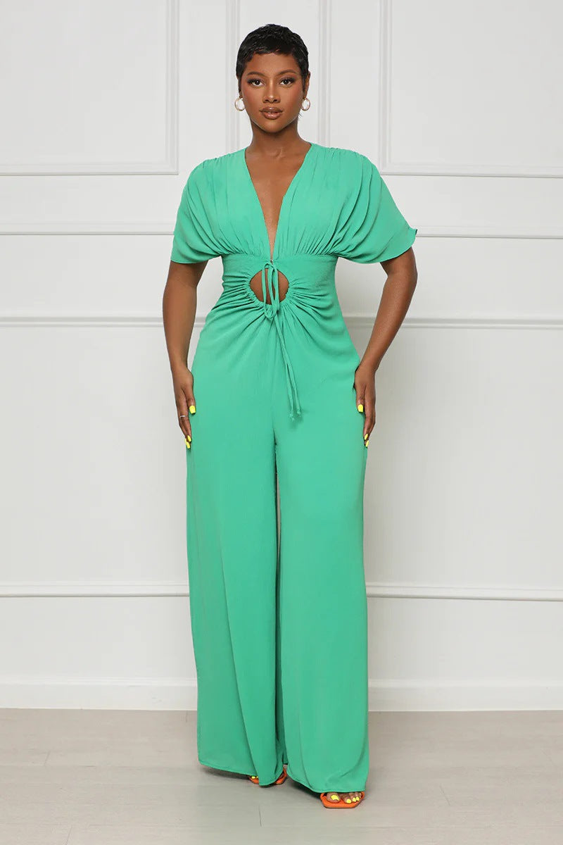 Solid Color V neck Batwing Sleeve Hollow Out Cutout Lace up Jumpsuit
